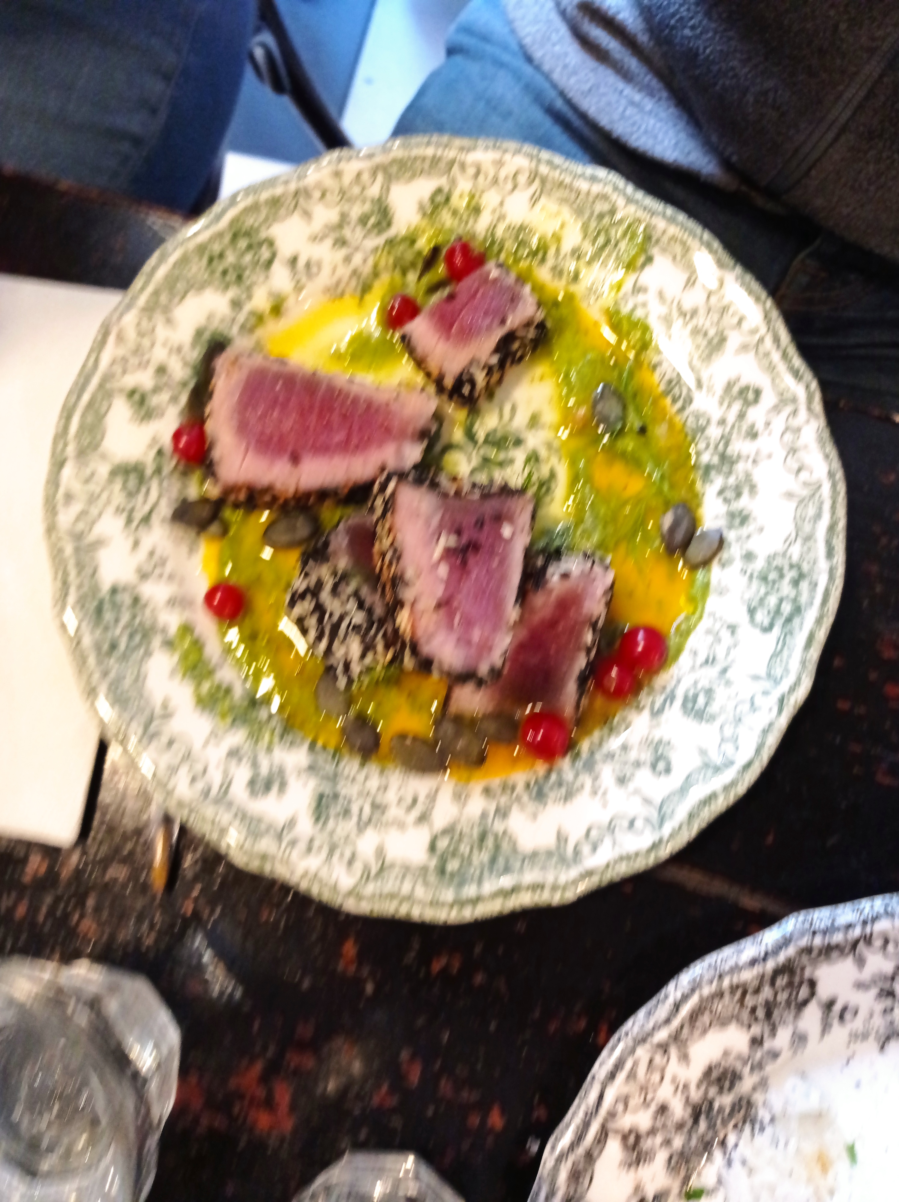 Nous avons pris un came vert rôti, des pâtes à la truffe et le tartare saumon/avocat/frites. Tout était super bon et le personnel très sympathique.