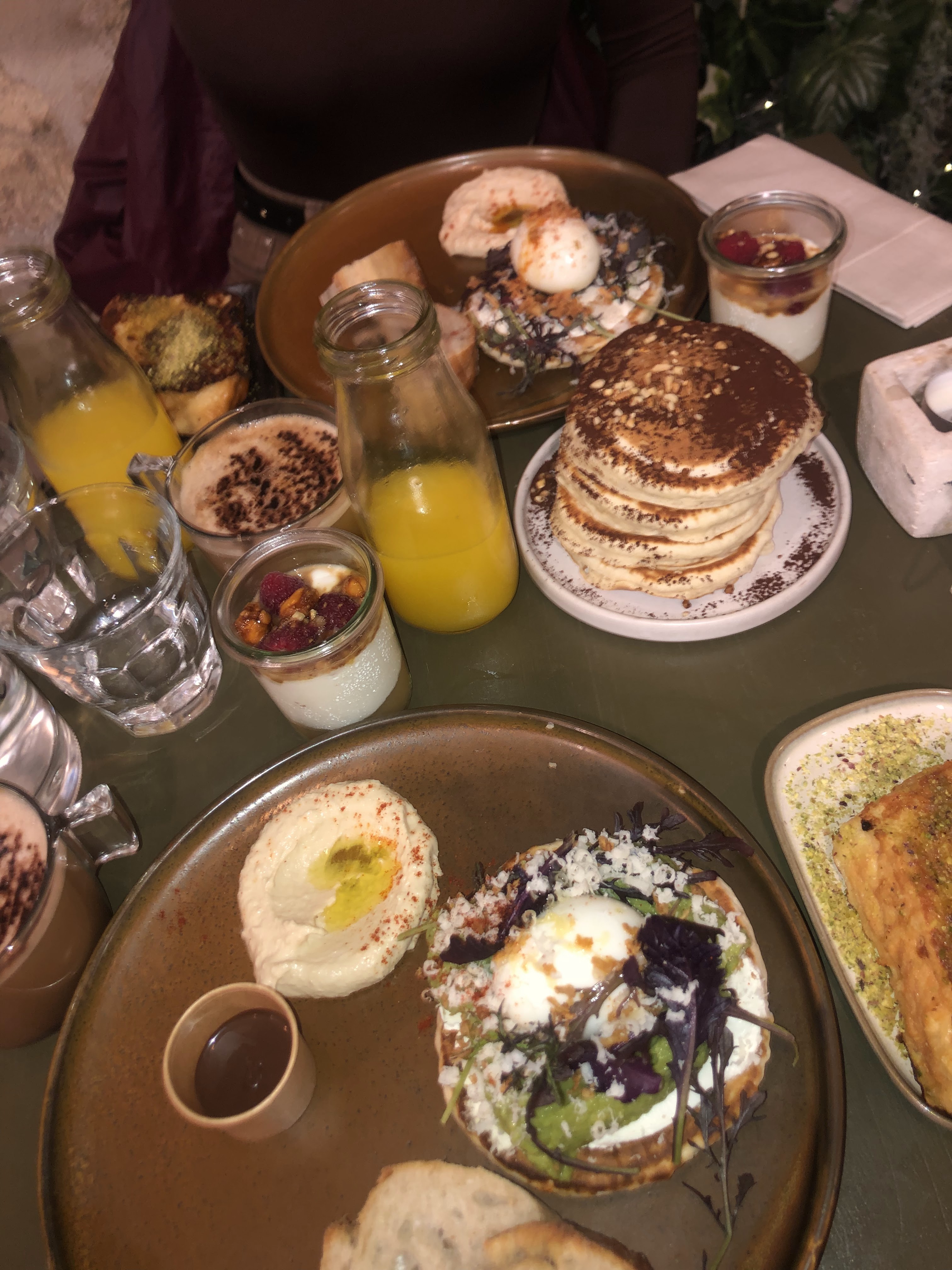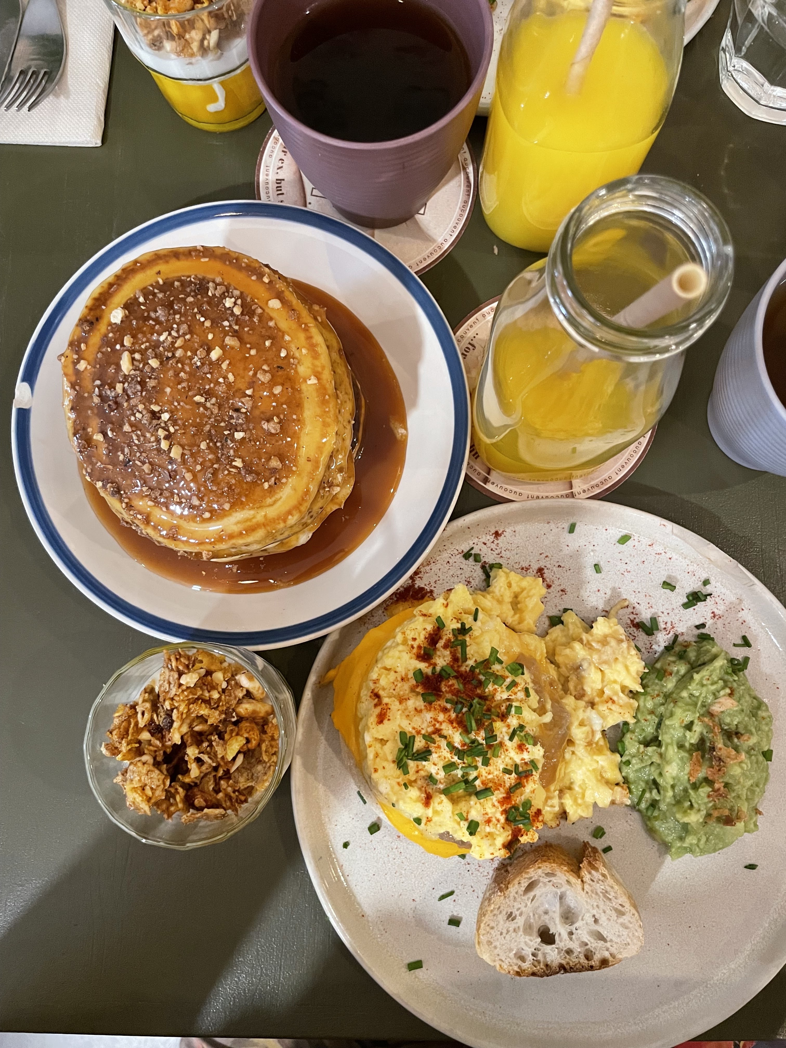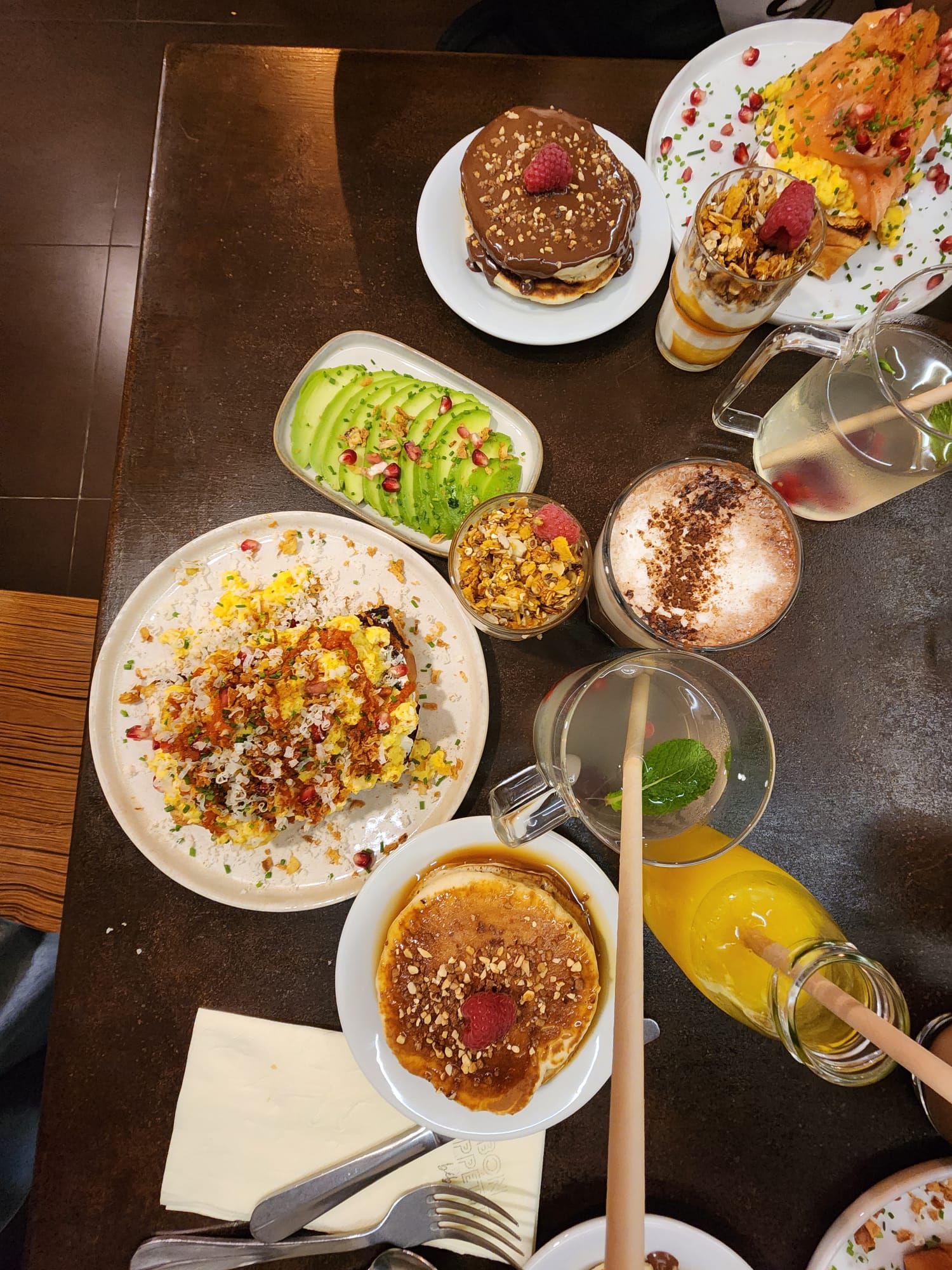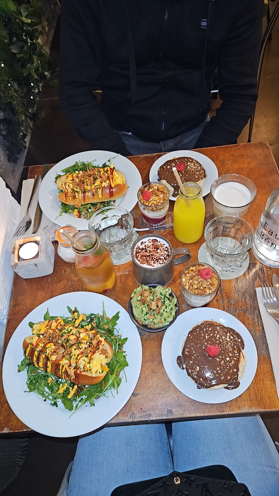 Ambiance chaleureuse, jolie decoration et beau concept avec que deux formules proposées, mais malheureusement n’atteint pas la hauteur de nos attentes. Nous sommes venus le weekend pour profiter de la formule brunch à 29€. La formule est très chargée avec 2 boissons, un toast avocat sur pancake avec oeuf frais, du houmous, une brioche façon pain perdu, du yaourt grec et 2 gros pancakes sucrés. De manière globale la présentation est belle et la nourriture est bonne, mais on trouve qu’il n’y avait pas assez d’houmous (qui était excellent) et que les pancakes étaient assez fades. A notre grande surprise, ils ne proposent ni fruits ni sirop d’érable pour accompagner les pancakes, que du caramel beurre salé ou pâte à tartiner et ces toppings rendait la dégustation bien moins gouteuse. Comparé aux autres endroits ou nous avons brunché, on n’a pas trouvé ces plats éblouissant ni légitimes pour le prix.
