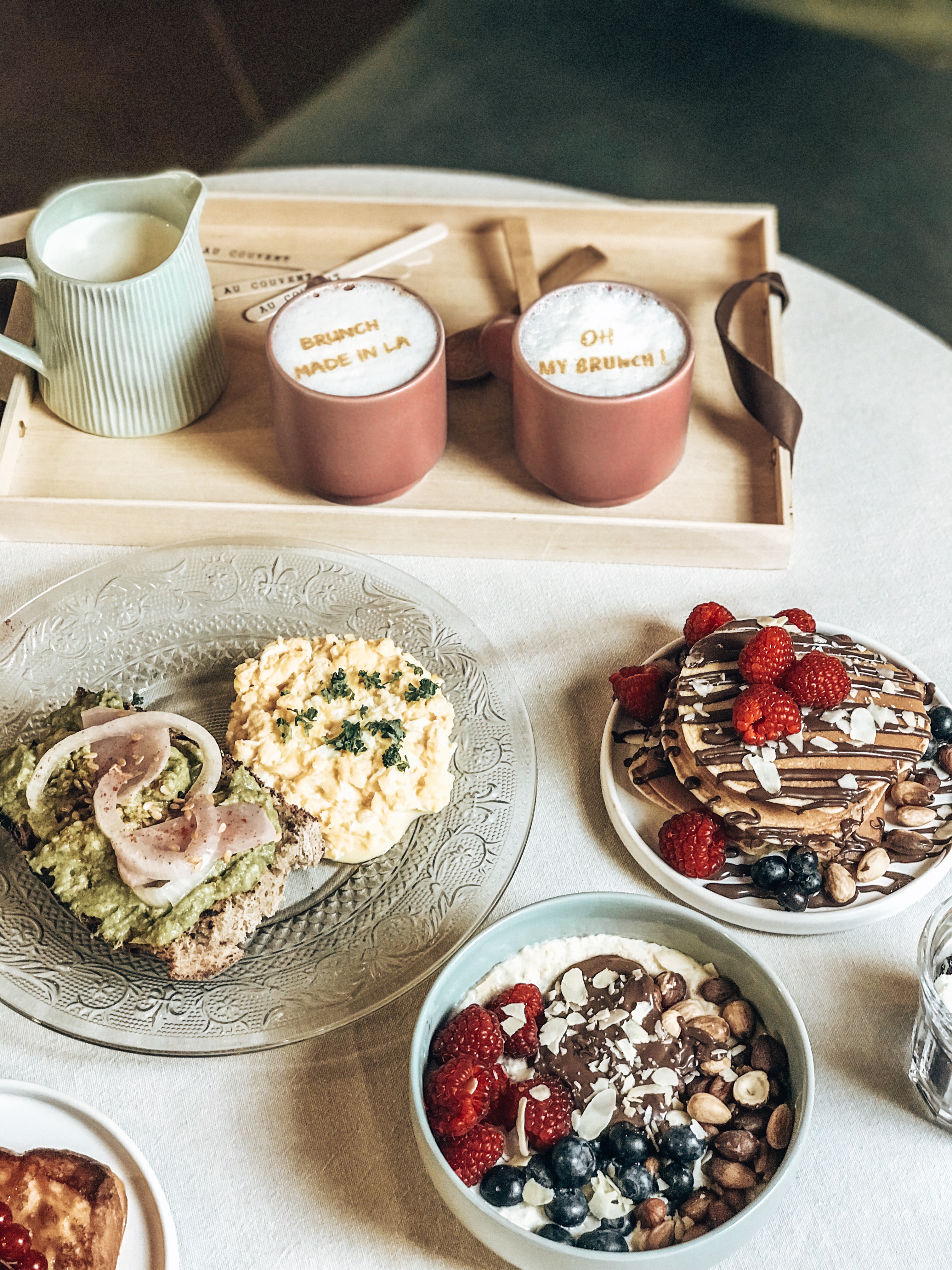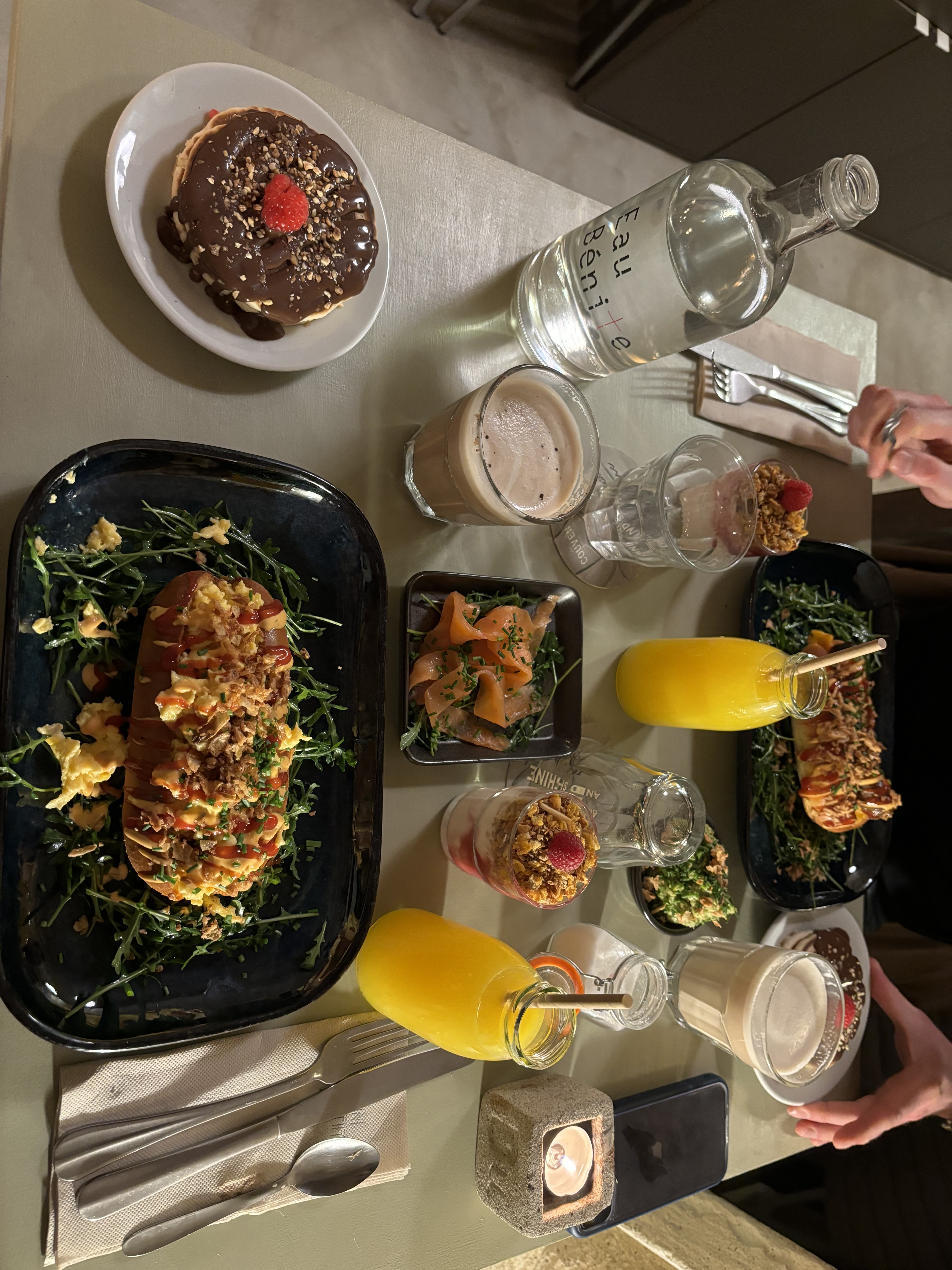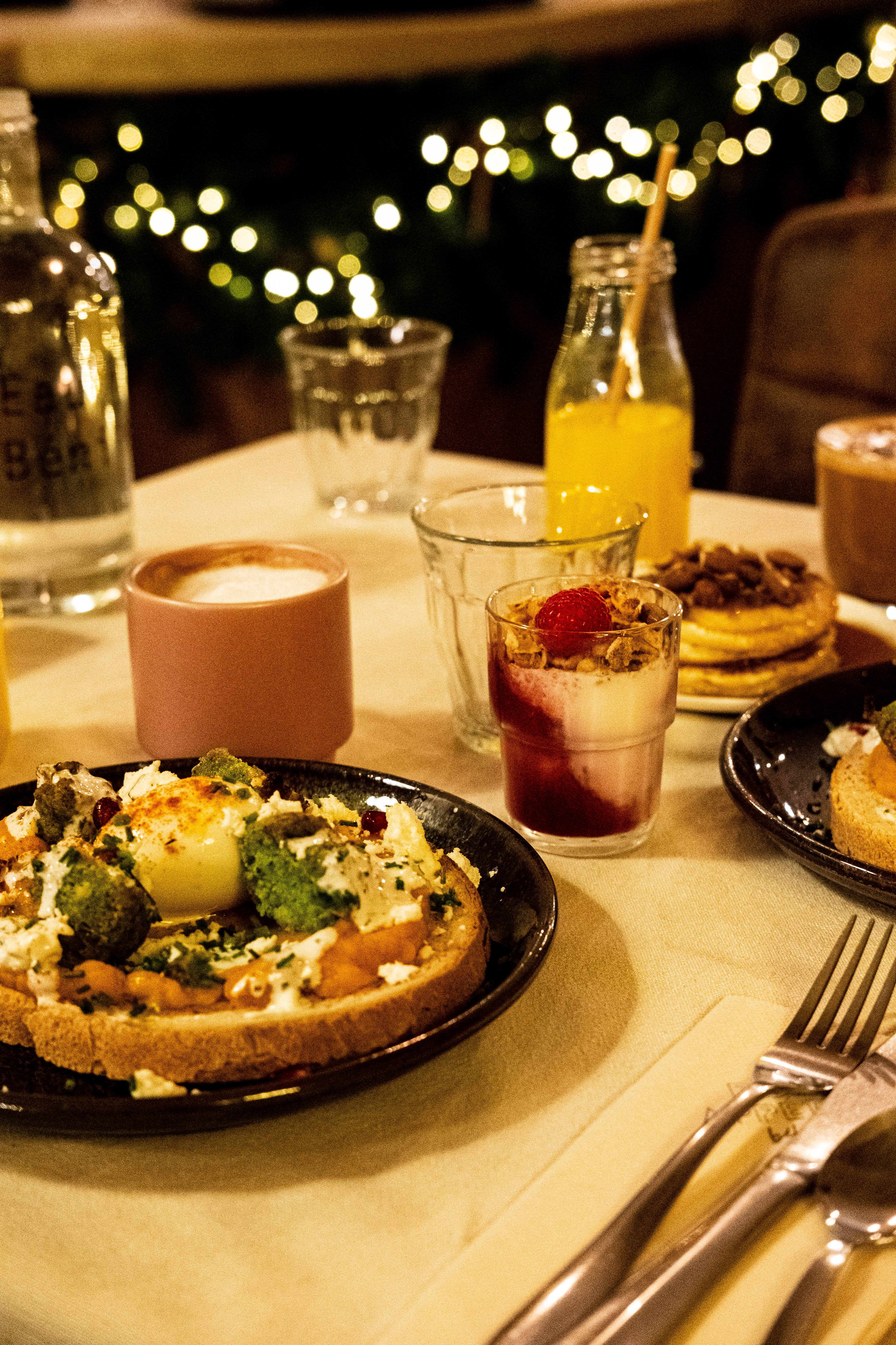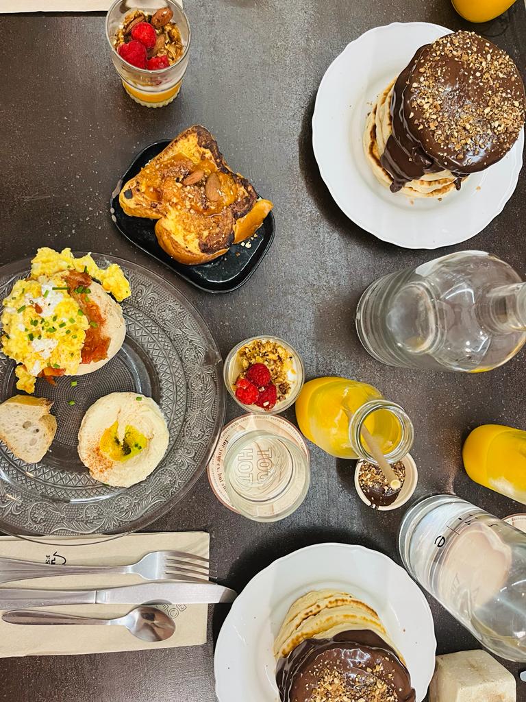 Ambiance chaleureuse, jolie decoration et beau concept avec que deux formules proposées, mais malheureusement n’atteint pas la hauteur de nos attentes. Nous sommes venus le weekend pour profiter de la formule brunch à 29€. La formule est très chargée avec 2 boissons, un toast avocat sur pancake avec oeuf frais, du houmous, une brioche façon pain perdu, du yaourt grec et 2 gros pancakes sucrés. De manière globale la présentation est belle et la nourriture est bonne, mais on trouve qu’il n’y avait pas assez d’houmous (qui était excellent) et que les pancakes étaient assez fades. A notre grande surprise, ils ne proposent ni fruits ni sirop d’érable pour accompagner les pancakes, que du caramel beurre salé ou pâte à tartiner et ces toppings rendait la dégustation bien moins gouteuse. Comparé aux autres endroits ou nous avons brunché, on n’a pas trouvé ces plats éblouissant ni légitimes pour le prix.