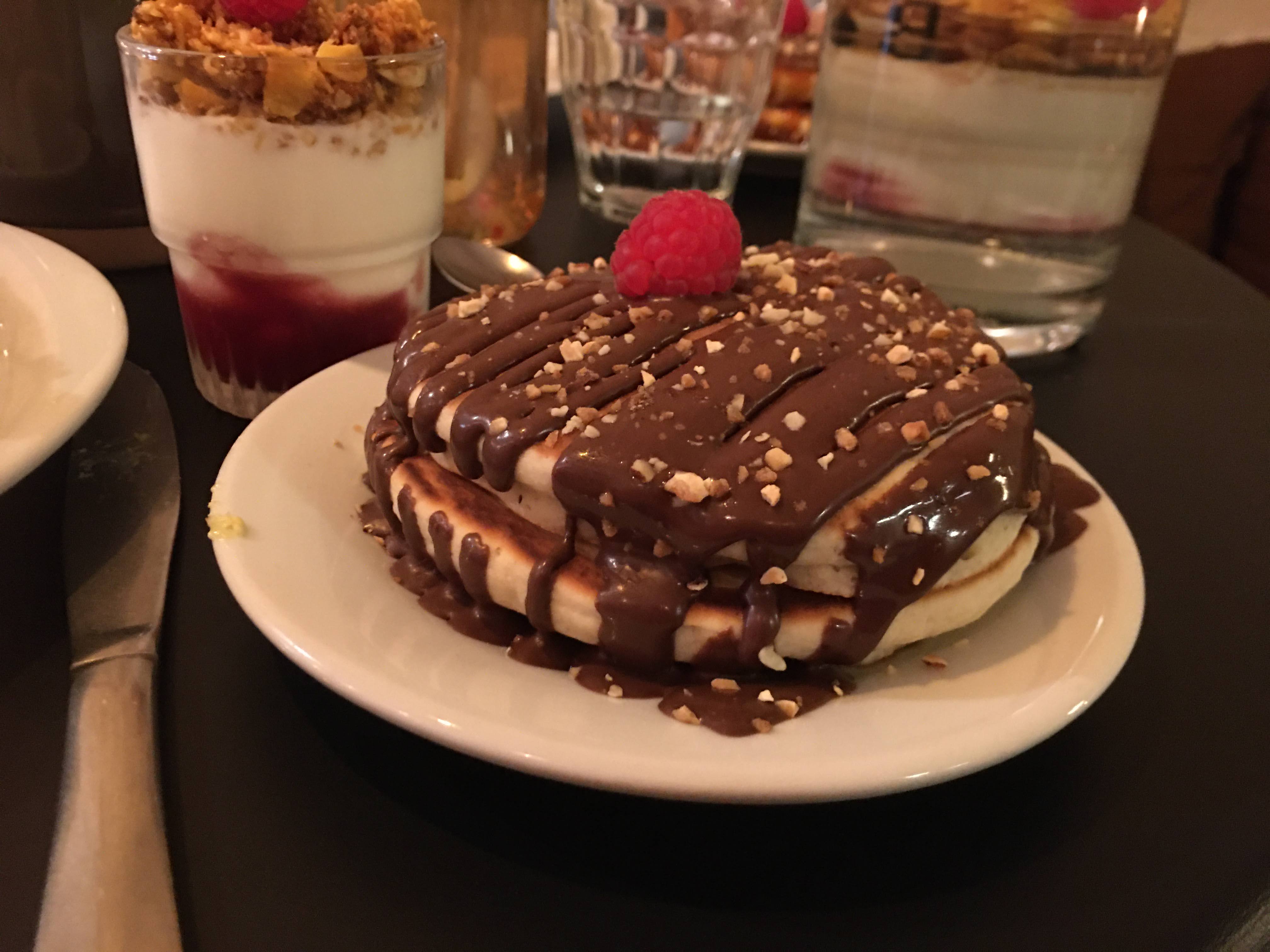 Avec ma soeur nous avions réservé leur fameux brunch à 29€ assez tôt. Les serveurs nous ont accueillies avec le sourire. La décoration et l’ambiance sont cosy, simples et branchés à la fois. Le brunch est composé d’une boisson chaude, un jus d’orange pressé, un plat salé, une petite Verrine de fromage blanc muesli, des pancakes (pâte à tartiner ou caramel) et enfin une brioche perdue. Tout était très bon: petit coup de cœur pour le plat salé qui était un muffin anglais avec un mélange de petits légumes en sauce style ratatouille et des œufs brouillés sur le dessus, vraiment délicieux! J’ai adoré également la brioche qui était sucrée comme il faut et bien moelleuse.