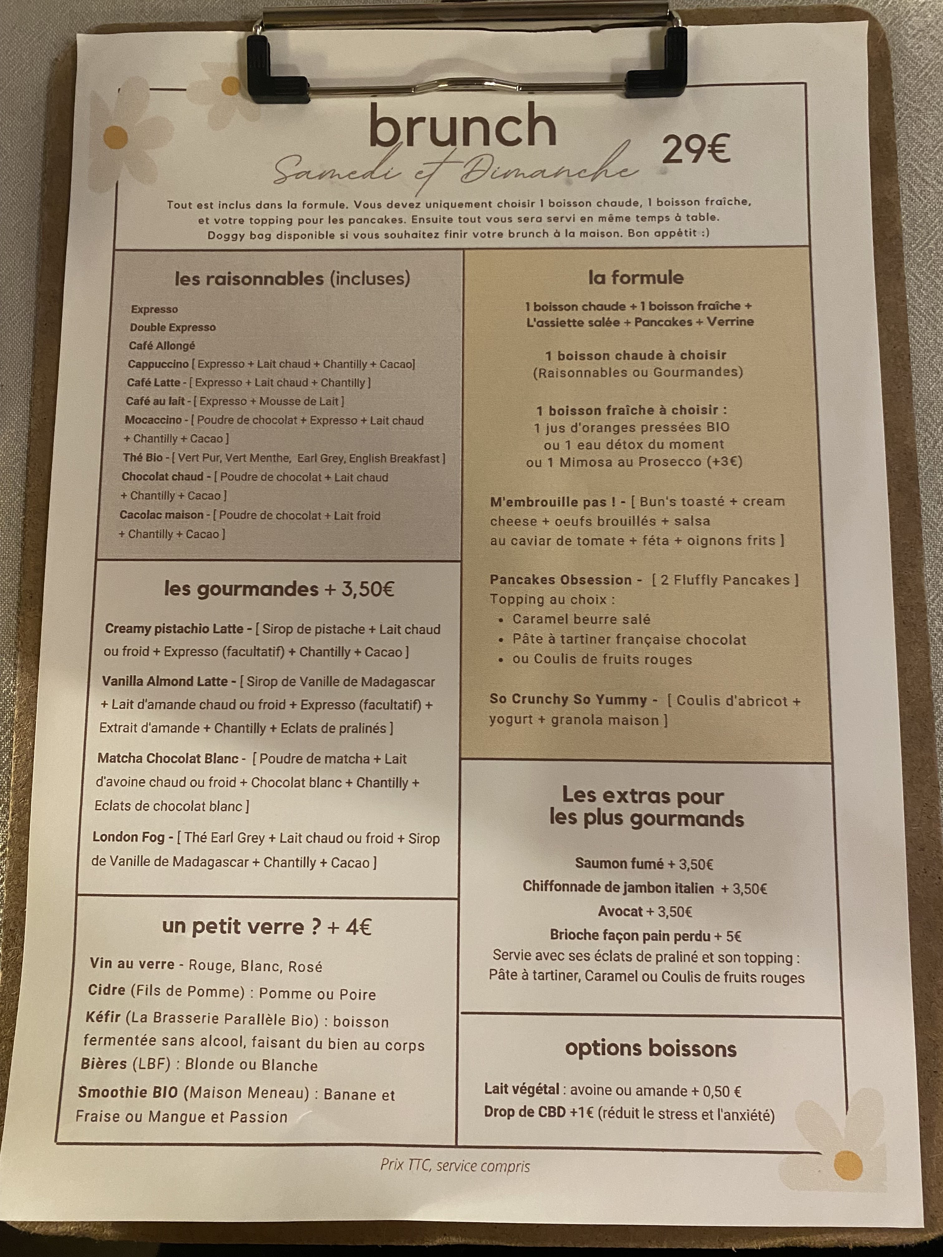 Bonjour Raphaël, Nous vous remercions d'avoir pris le temps de partager votre expérience. Le prix de 29 euros comprend tout de même : Une boisson chaude, un jus d'orange pressé, une assiette salée avec une brioche toastée, œufs bio frais brouillés accompagnés d'une crème au pécorino et parmesan, une salade fraîche aux olives de Kalamata et ses condiments méditerranéens. Il y a également un yaourt grec, coulis de fruits rouges et son Granola maison ainsi que 2 pancakes avec topping au choix (chocolat ou caramel beurre salé). Si vous prenez en compte le coût de la matière première (qui explose en ce moment mais nous n'avons pas changé nos prix pour autant), toutes les charges qui incombent à une entreprise et le travail réalisé derrière pour vous sortir un brunch de qualité, nous ne pouvons malheureusement pas baisser notre prix ni même augmenter nos quantités qui sont déjà conséquentes (car la plupart des clients prennent un doggy bag pour finir à la maison). Je peux tout de même comprendre que certains estomacs plus conséquents ne soient pas rassasiés après tout ça. Concernant la boisson proposée en fin de repas, dans aucun restaurant le serveur vous dit : Monsieur, souhaitez-vous un café en fin de repas en supplément ? Ou bien, souhaitez-vous une eau pétillante en supplément ? Il n’est pas mentionné sur la carte que les boissons sont à volonté … En vous souhaitant une belle journée, Marine Alengry, Gérante