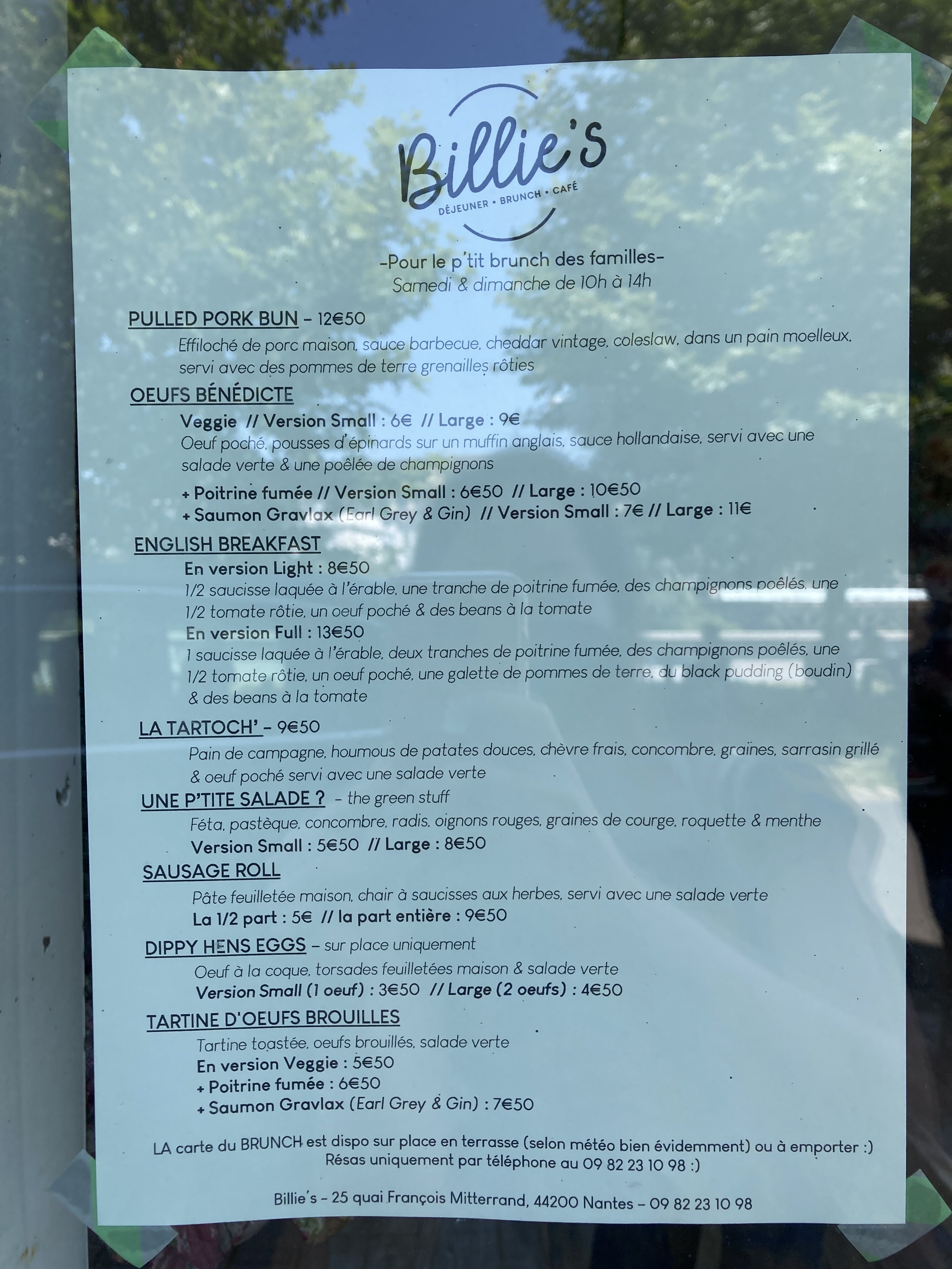 Très bonne découverte du Billie’s ce dimanche. Nous avons très bien mangé et tout apprécié, du Pistaccio Latte au croissant salé aux œufs brouillés sans oublié le pecan pie et gâteau aux dattes pour finir sur une note sucrée. Le prix reste un peu élevé par rapport à ce qu’on nous pensions payer mais nous reviendrons sans hésitation, après en avoir testé plusieurs sur Nantes celui-ci reste le plus brunché!
