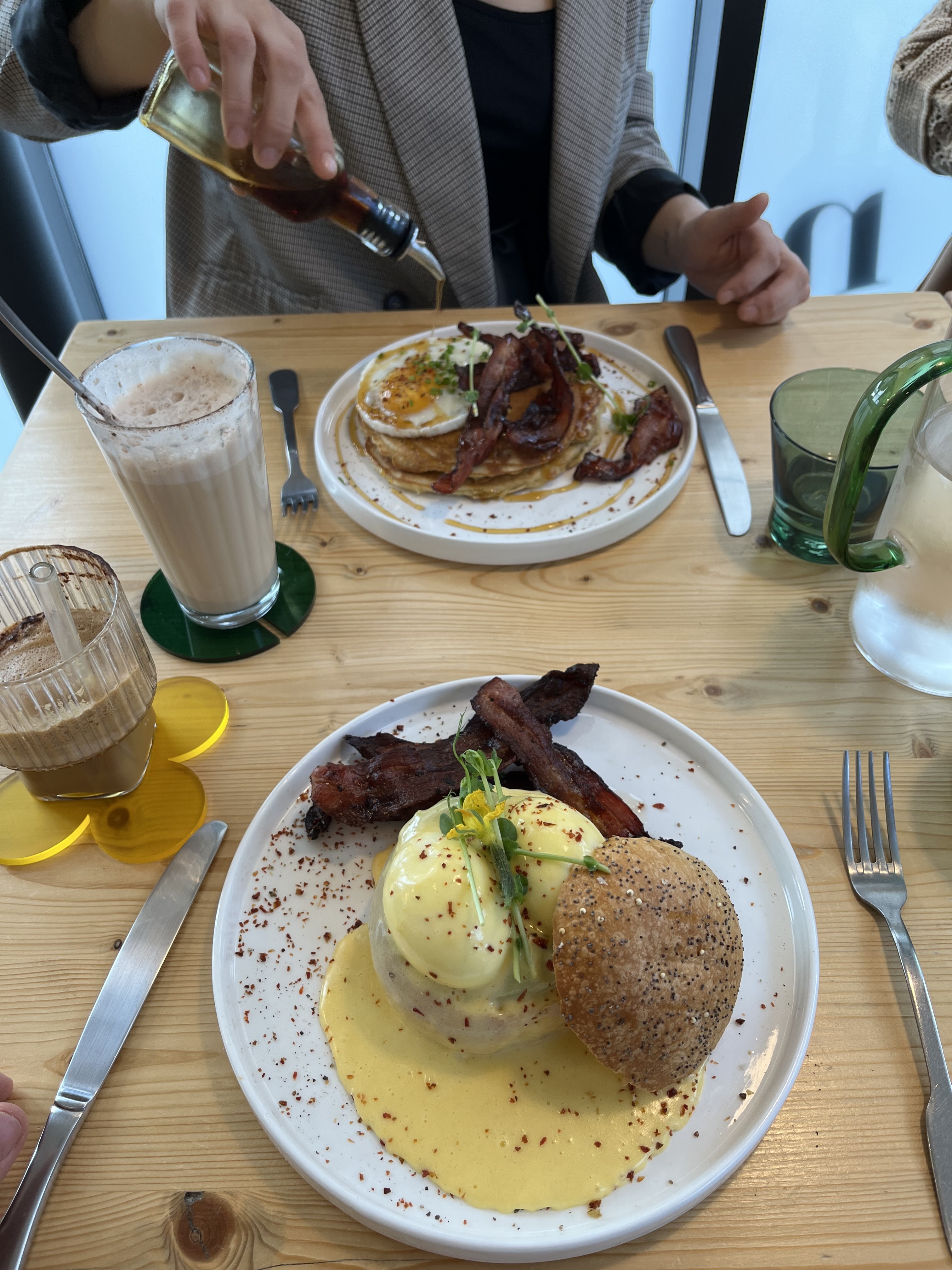 L'endroit est décoré simplement jouant sur le côté concept avec une belle terrasse extérieure. Mais lorsqu'on se veut un lieu pour bruncher on se doit de proposer un veritable brunch à composer soi même et non pas quelques plats tout fait. Voir photo carte Le lieu est joli mais cependant cela ne suffit pas car ce n'est pas juste la déco qui fait d'un lieu que l'on est envie de s'y rendre mais aussi son offre gastronomique. Lorsque l'on parle de brunch on sait que cela peut être vraiment varié. Malheureusement ici ce ne sera pas le cas. On vous proposera une carte avec quelques plats (très photogénique mais sans saveur). J'ai pour ma part lors de ma visite, demandé un café Latte et des pancakes avec oeuf et bacon. Le café latte servi en verre à limonade sans autre, j'ai du demander du sucre pour pouvoir le déguster à mon goût. Les pancakes étaient malheureusement sans saveur et le bacon bien que bien grillé, n'avait pas cette touche crispy qui est nécessaire à ce plat car il avait été préparé bien à l'avance et juste réchauffé au moment de le servir. Le résultat est que j'avais du bacon caoutchouteux, ultra salé et des pancakes insipides. Je regrette mais plus un plat est simple et plus les seuls ingrédients utilisés pour le confectionner doivent être de bonne qualité car sinon on obtient un plat de médiocre saveur. En résumé et à mon avis si vous chercher un vrai brunch ce ne sera pas l'endroit adequate