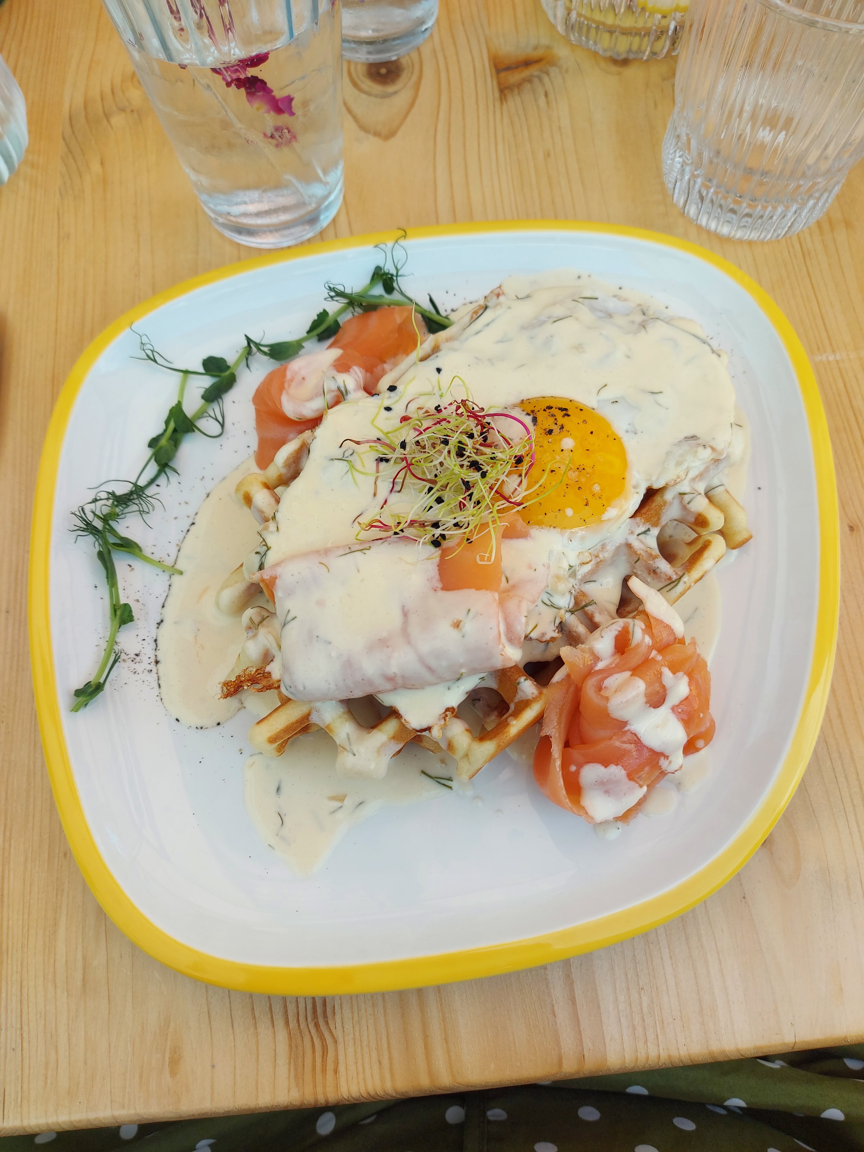 Quelle bonne surprise ce concept de gauffres salée ‼️ Le lard bien grille , l œuf par dessus et la sauce hollandaise se marient parfaitement, c est délicieux. La petite terrasse est charmante , l accueil est sympa et le service très réactif, bravo je reviendrai avec plaisir .