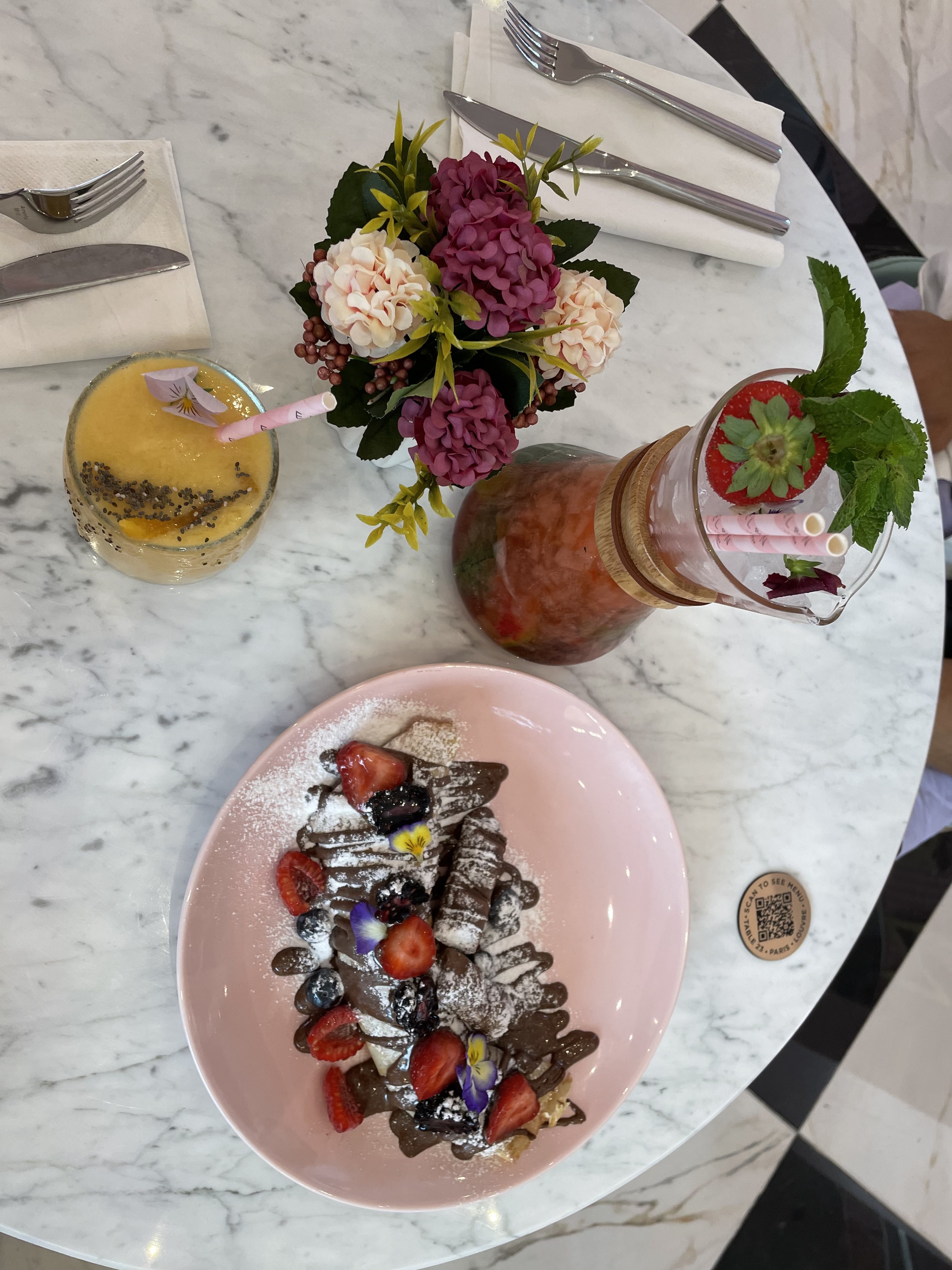 J’y suis allée surtout pour la beauté du lieu et passer un moment agréable avec une amie. C’est un endroit très agréable, mais ne pas y aller aux heures d’affluence car on a attendu nos boissons un moment et mon moka est arrivé refroidi alors que nos desserts étaient déjà bien entamés, La brioche est pas mal mais les pancakes pas assez moelleux et un doute sur le fait que ce soit du vrai Nutella, on reviendra peut-être pour le côté salé