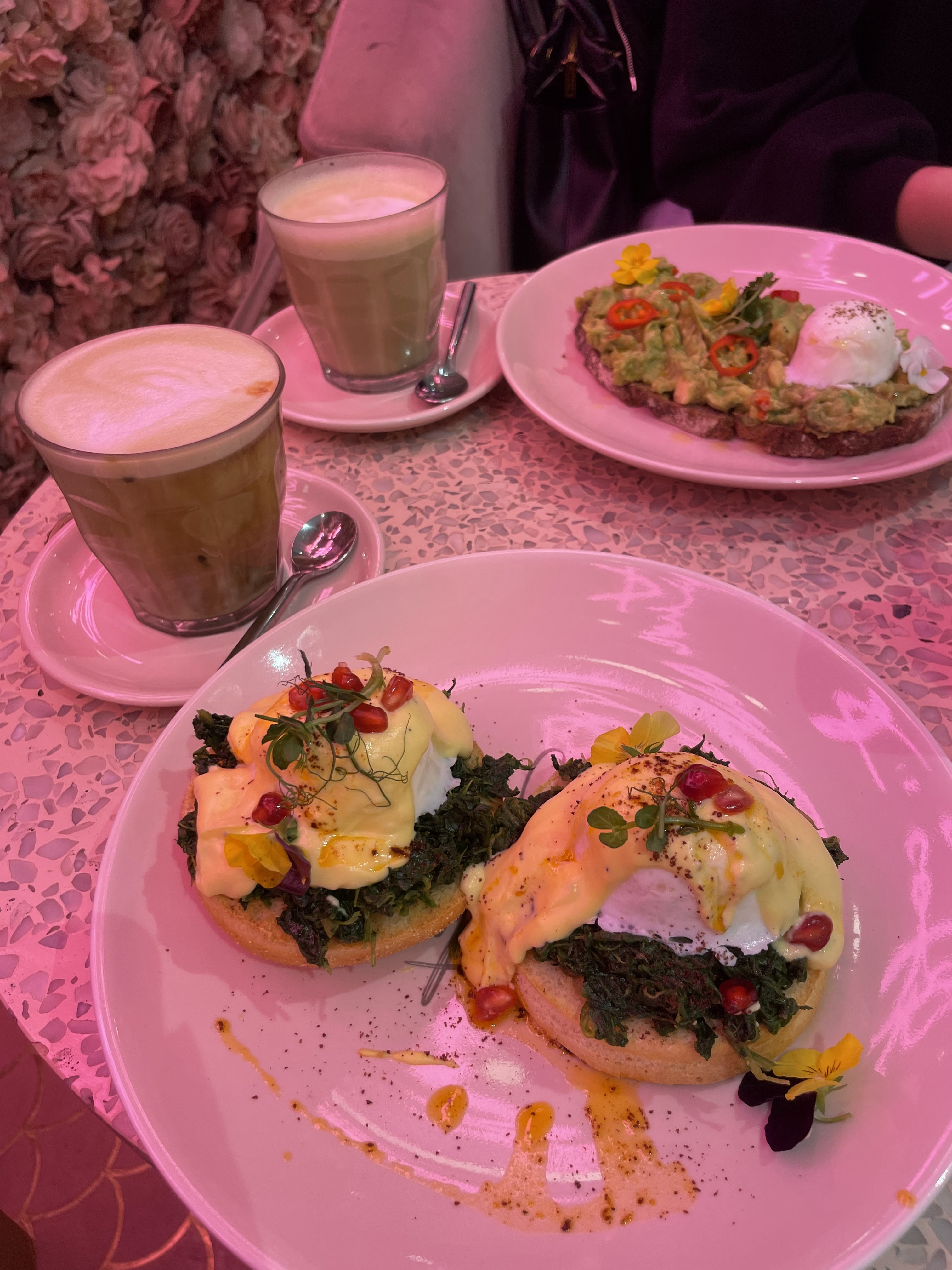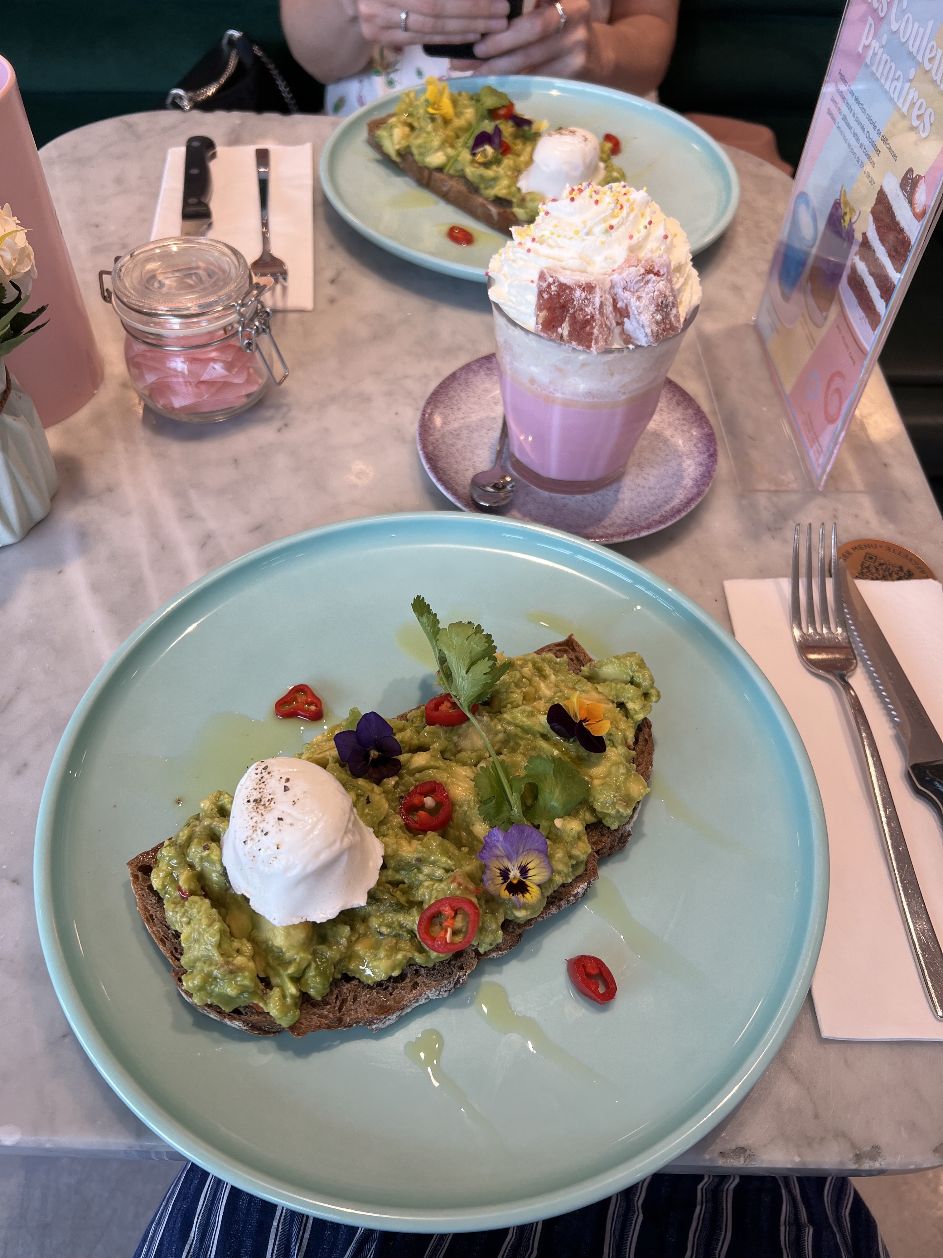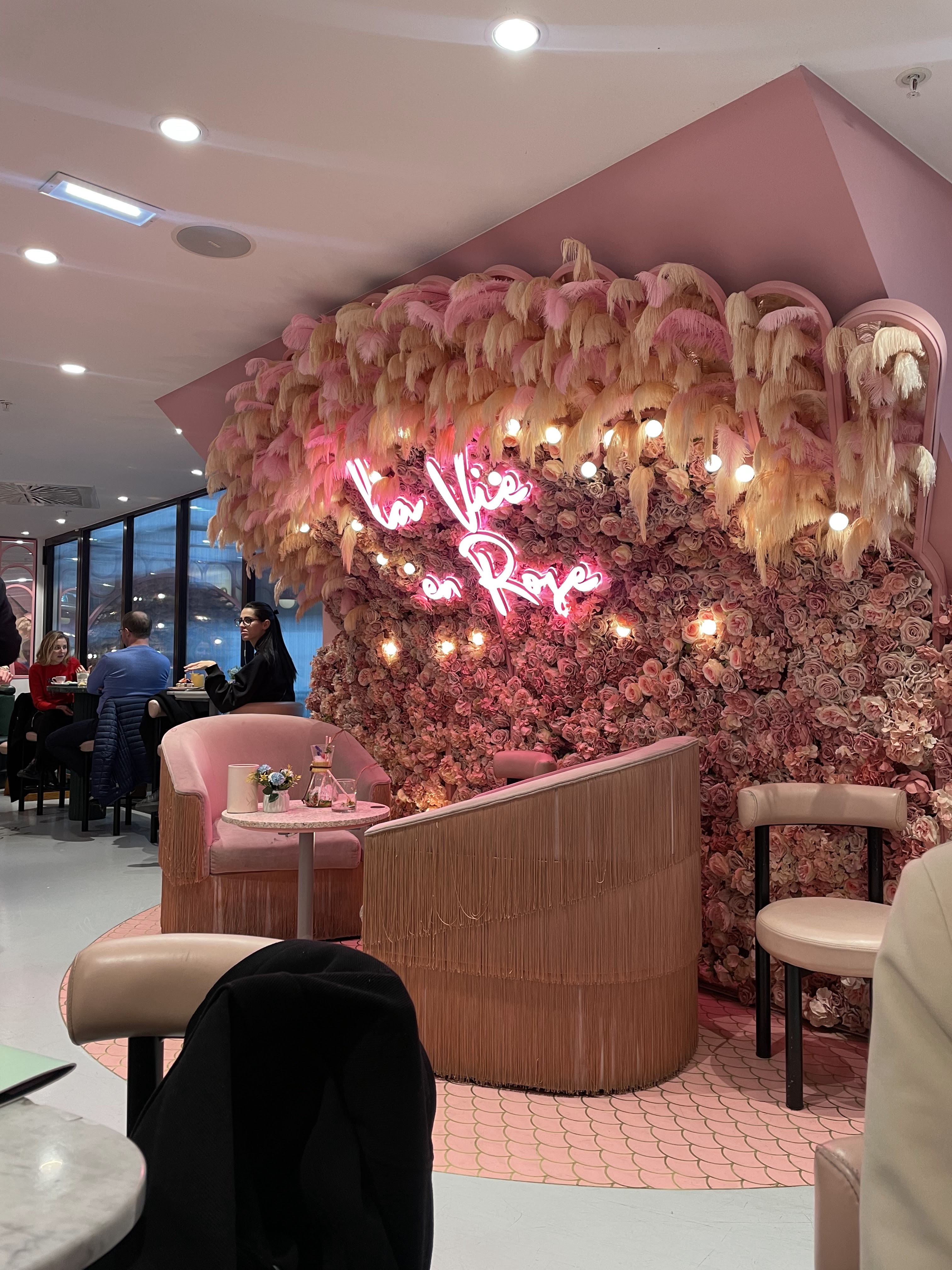 Pti endroit très girly comme j'aime !!! Tout est rose 🥰👌🏾 Par contre prévoyez au moins 1 bonne heure d'attente avant d'obtenir une place plus ou moins acceptable!!! Car certaines tables se trouvent près de la file d'attente... du coup tous les regards se posent sur vous et votre assiette... sentiment pas très agréable pour le coup!!! 🤷🏽♀️ Une fois assis il faut savourer ce moment gustativement et visuellement 👌🏾💯 De la boisson au dessert 😋 le visuel est juste magique et au goût magnifique!!! Je recommande vivement. Par contre entre la boisson le plat et le dessert il faut compter une moyenne de 45€ 😆 Sinon à tester au moins 1 fois pour se faire ses propres impressions 😉