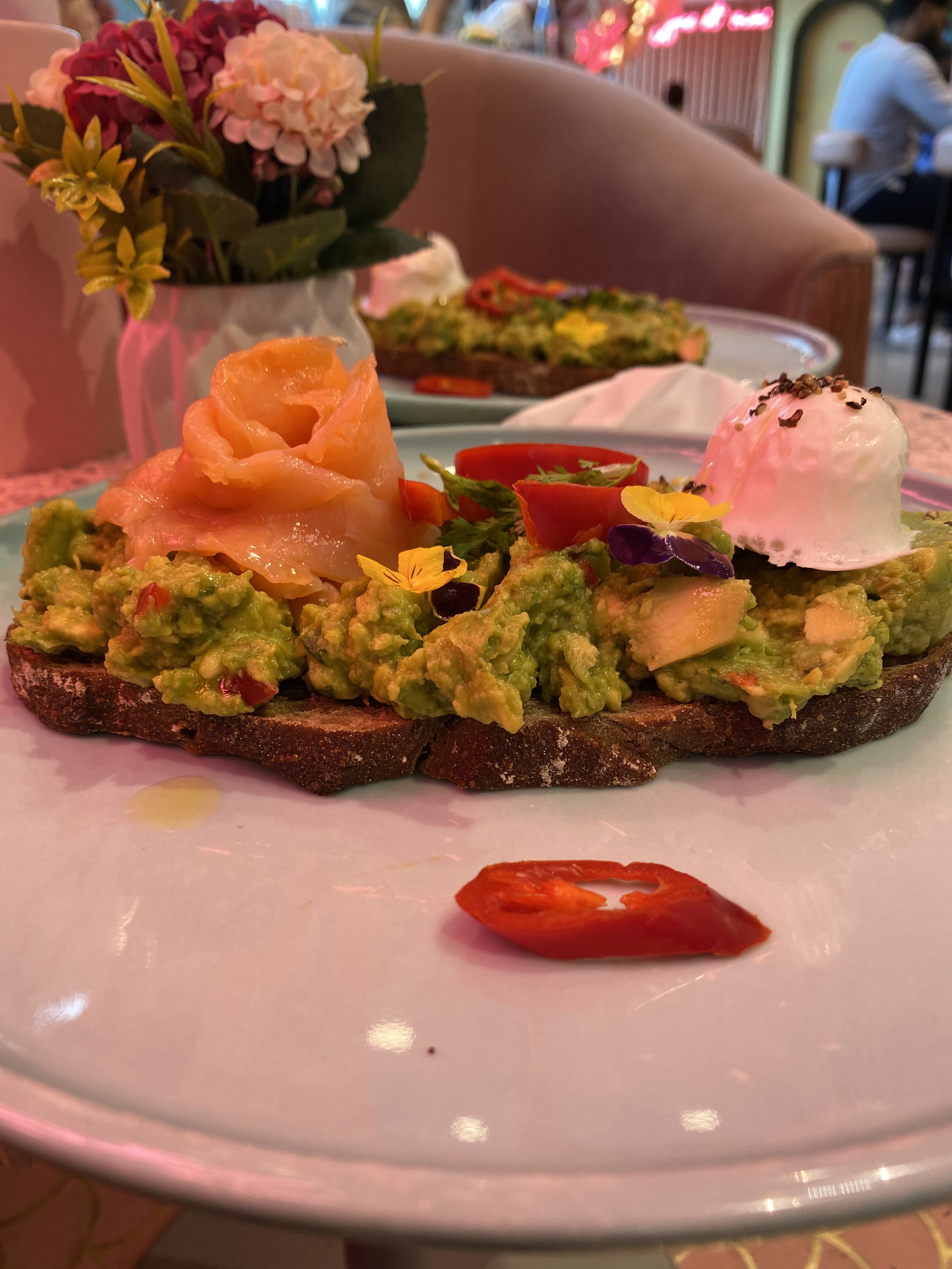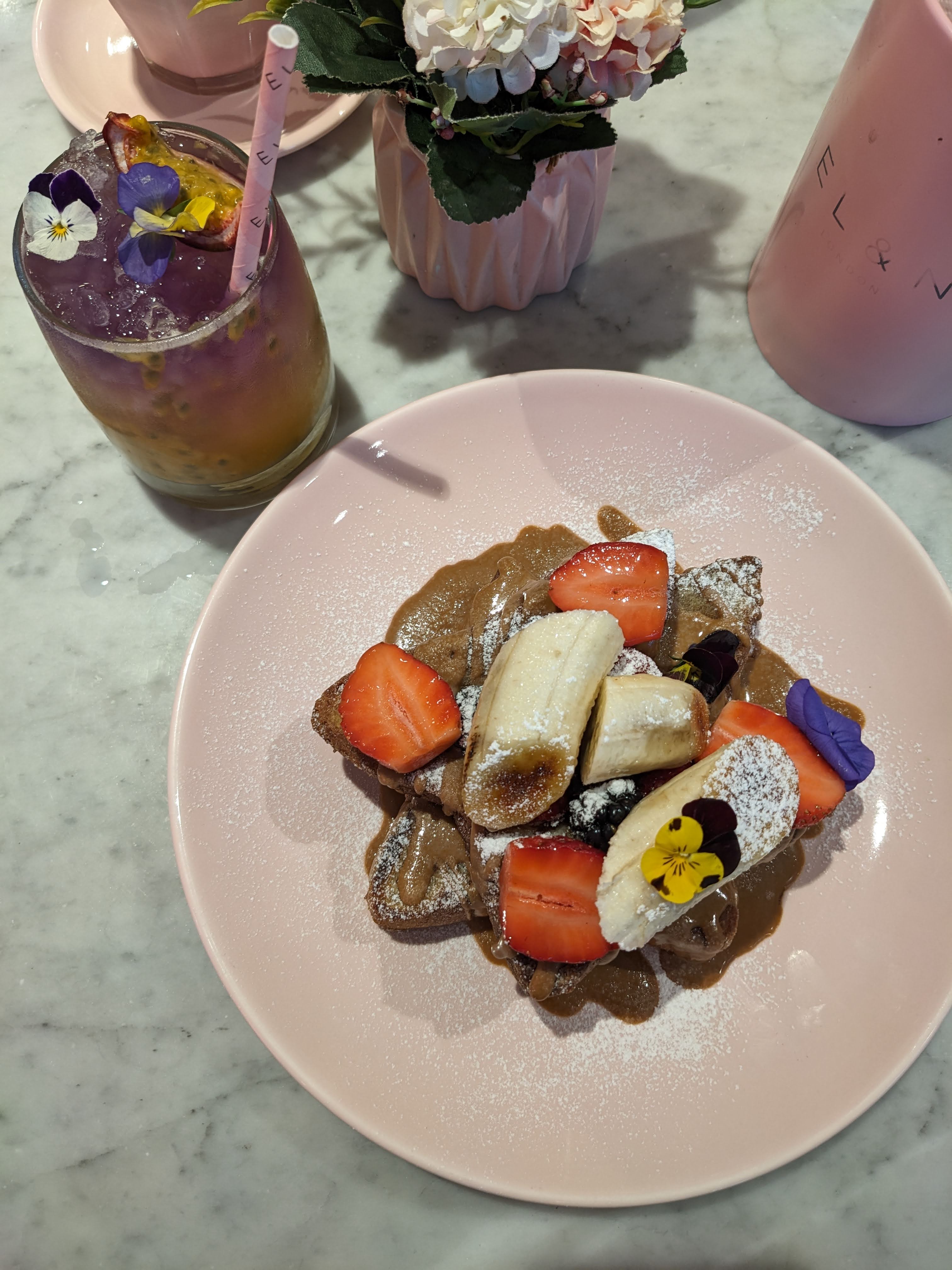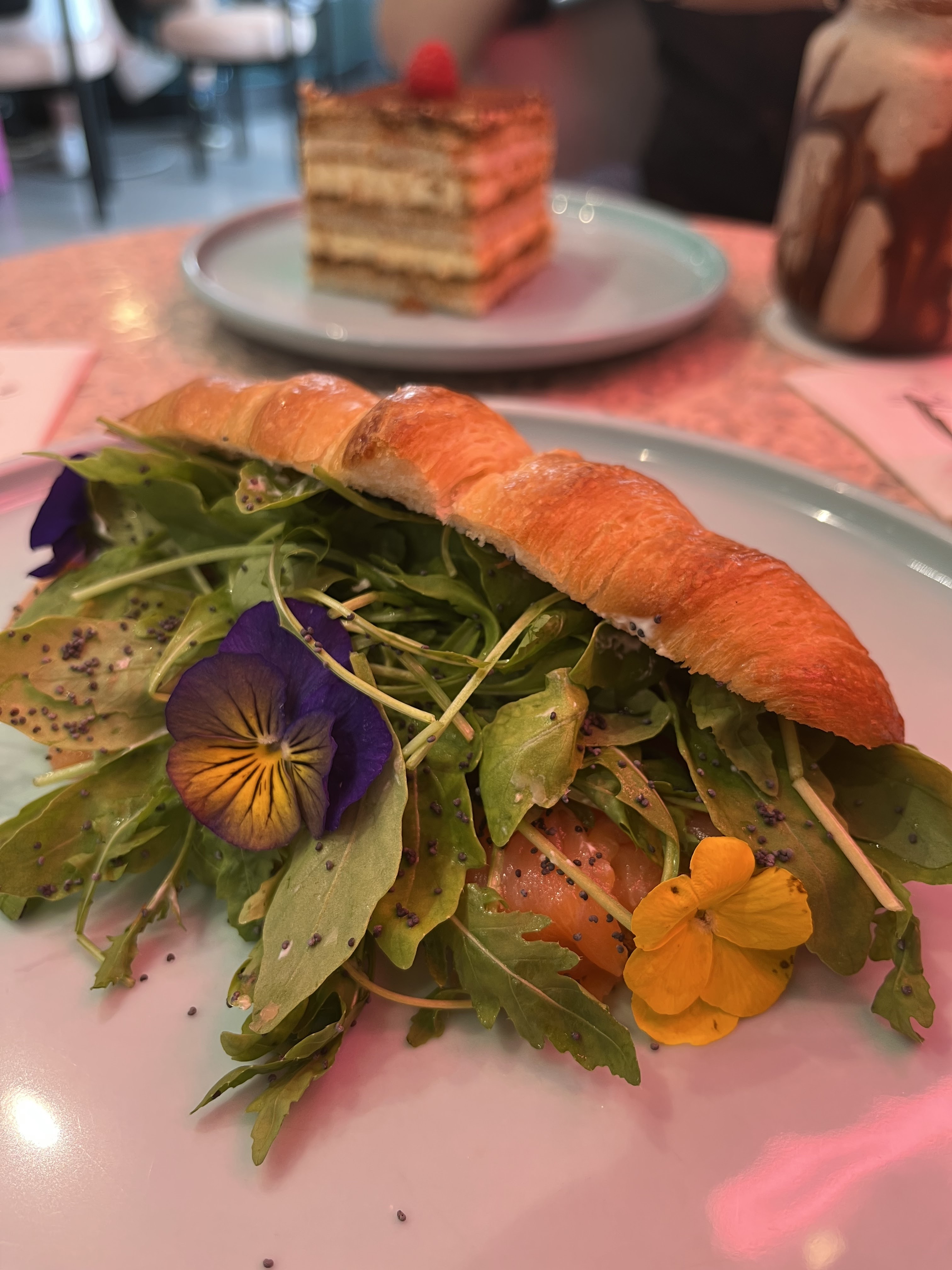 Pti endroit très girly comme j'aime !!! Tout est rose 🥰👌🏾 Par contre prévoyez au moins 1 bonne heure d'attente avant d'obtenir une place plus ou moins acceptable!!! Car certaines tables se trouvent près de la file d'attente... du coup tous les regards se posent sur vous et votre assiette... sentiment pas très agréable pour le coup!!! 🤷🏽♀️ Une fois assis il faut savourer ce moment gustativement et visuellement 👌🏾💯 De la boisson au dessert 😋 le visuel est juste magique et au goût magnifique!!! Je recommande vivement. Par contre entre la boisson le plat et le dessert il faut compter une moyenne de 45€ 😆 Sinon à tester au moins 1 fois pour se faire ses propres impressions 😉