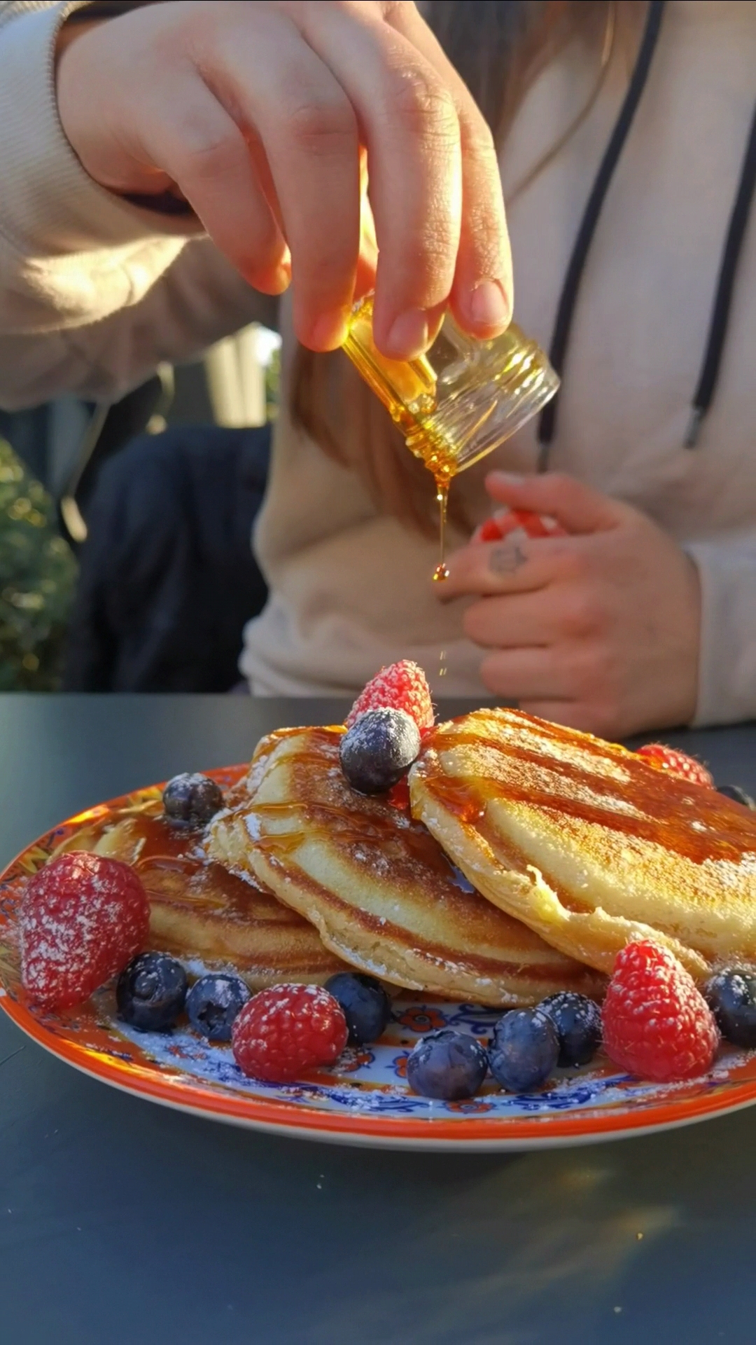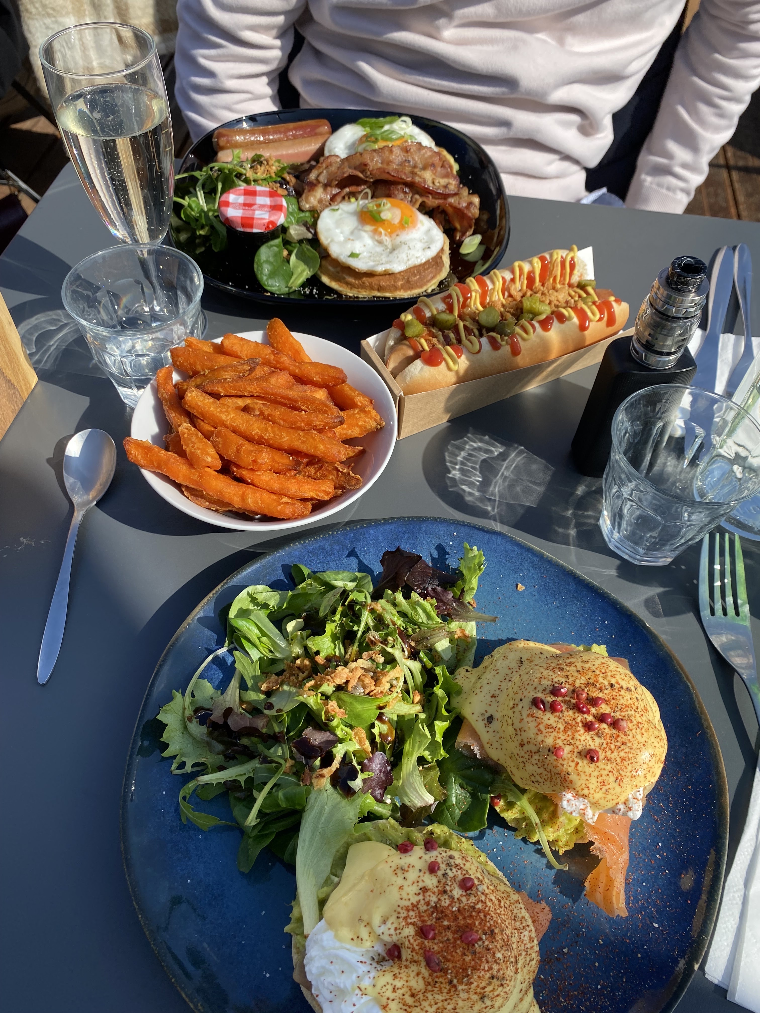 Cet endroit dépasse de loin mes attentes ! La nourriture, le service et l'emplacement étaient fantastiques ! Et les serveuses parlaient anglais. Le seul point négatif était que certains clients fumaient près de chez nous. Cependant, vous ne pouvez pas contrôler cela. Sur la photo, des œufs Bénédicte et des crêpes à la banane avec du caramel et des noix. Nous n'avons pas commandé de frites de patates douces, mais elles avaient l'air fantastiques ! Nous avons payé environ 20 euros par personne.