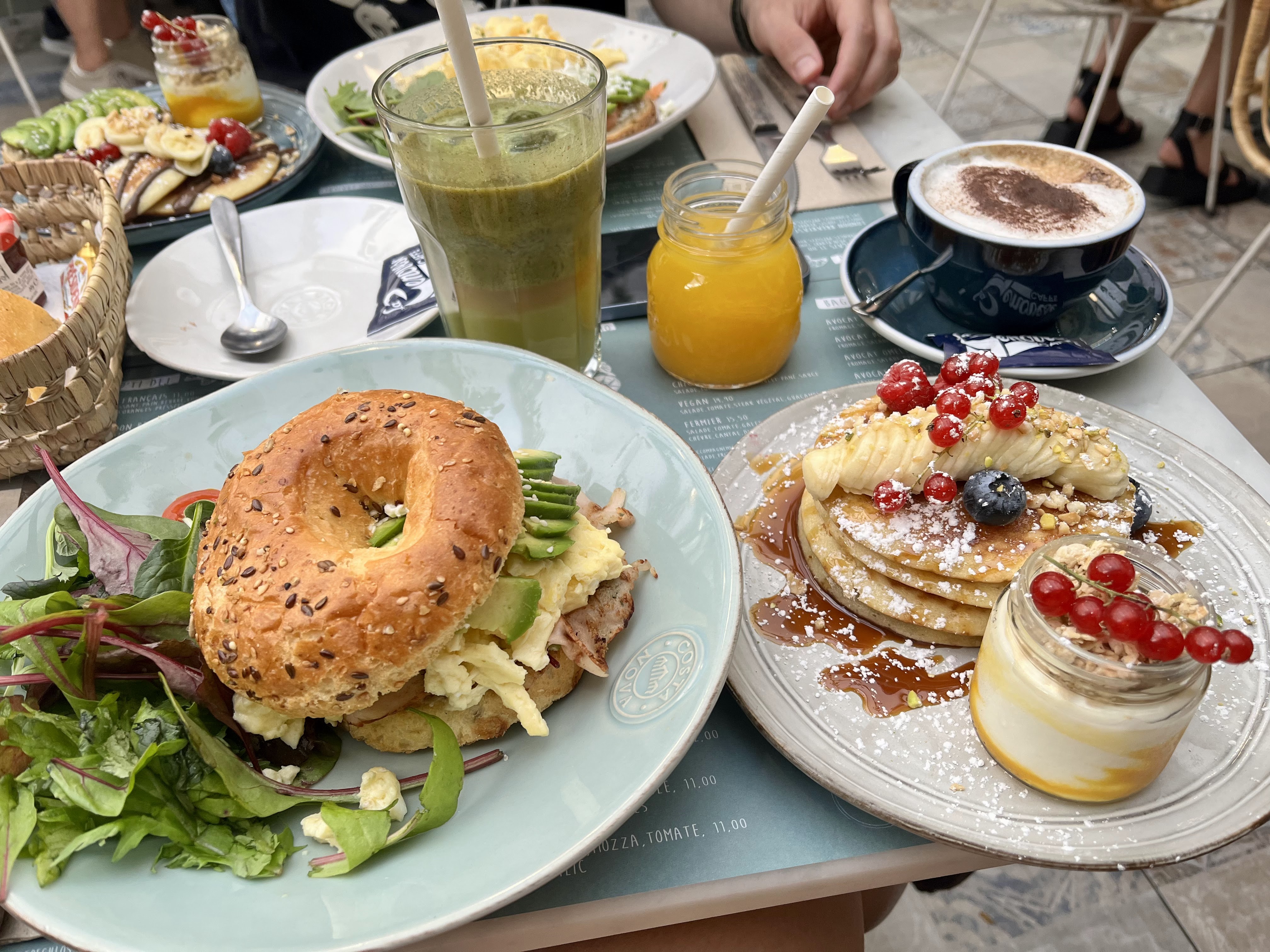En voyant la queue devant le café on pourrai s'attendre à avoir quelque chose d'exceptionnel.. Or j'ai été déçu... Ils ont peut être de très bon communiquant..mais la qualité n'est pas terrible J'ai pris un brunch Miami. Une fois le cappuccino servi avec le smoothie il a fallu attendre au moins 15 min avant le service du bagel et pancake. Il a fallu réclamer sel et poivre et huile d'olive car les œufs brouillés du bagel été absolument fade... C'est dommage.. La dame a côté de nous en a profité pour nous prendre le sel aussi... Elle a du nous entendre.. Pourquoi ne pas mettre sel poivre et assaisonnement d'office à chaque table ?.. Bref le café a été bu depuis longtemps car si non il aurai été froid... Le smoothie était a la hauteur.. C'est déjà ça. Mais les pancake quelle déception... C'est de l'industriel... C'est pas fait maison.. Du coup c'est sur c'est bien servi copieusement (4 pancakes) mais c'est lourd... J'aurai préféré 2 pancake maison à la place et que je finisse mon assiette.. Voilà... DÉÇU... On pense être au place to be mais le rapport qualité prix n'est pas la.