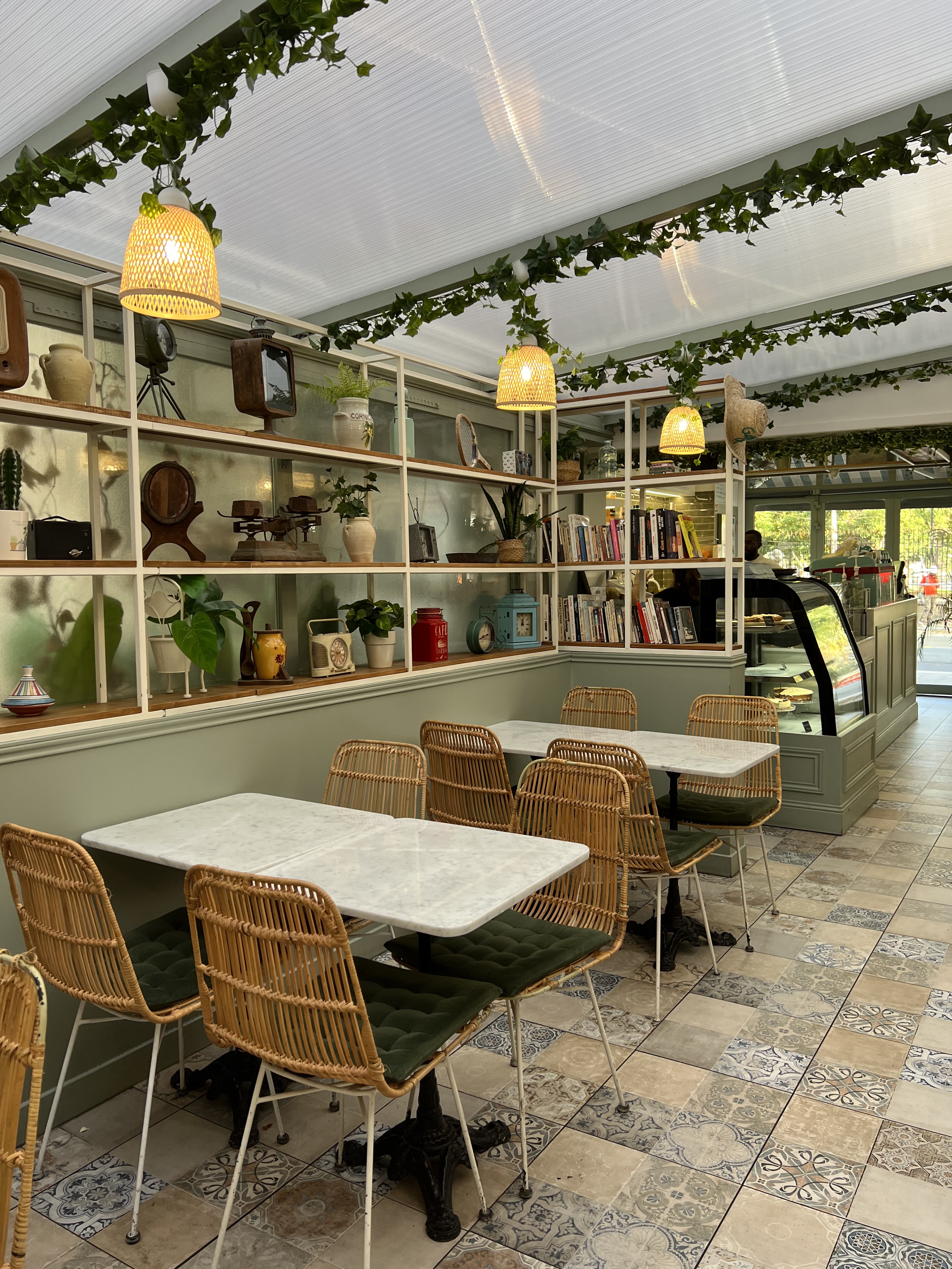 Café charmant avec ses sièges en velours, ses petites plantes et objets vintages posés sur les étagères sans compter que mon café crème accompagné d un délicieux croissant au chocolat top je recommande