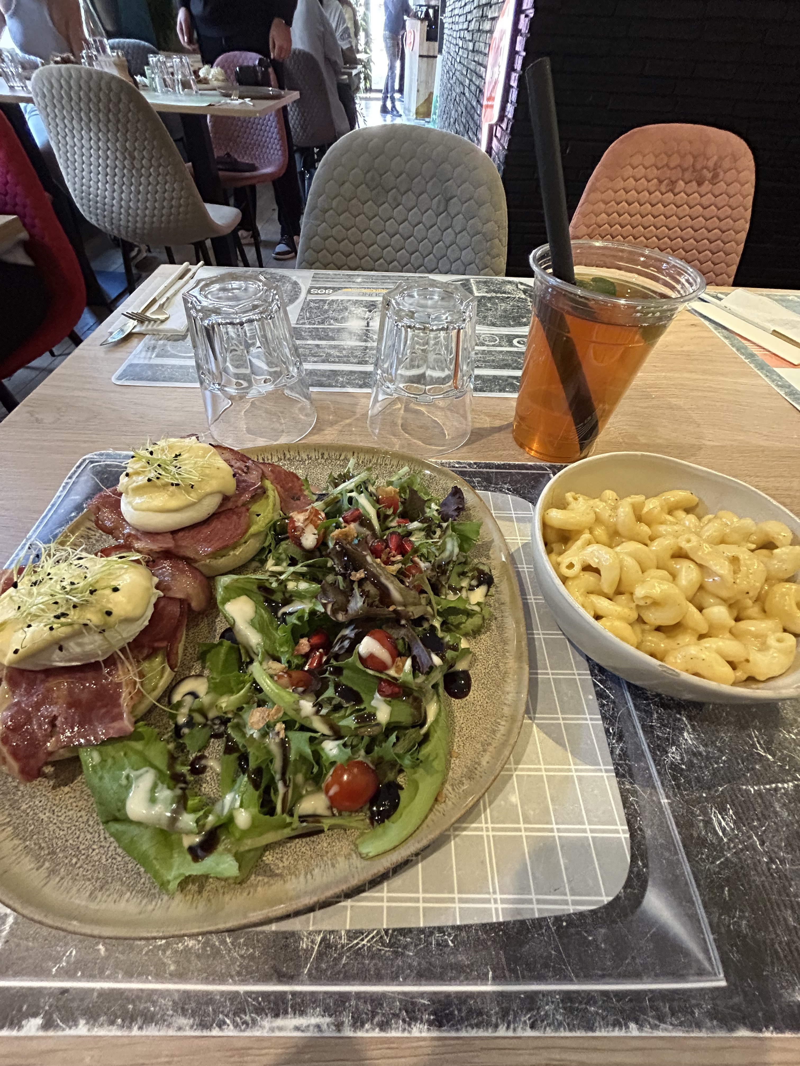 Personnel admirable, sympathique, mais la cuisine et la qualité ne suivent pas… Je mets 3 étoiles pour vous encourager car l’expérience n’y est pas encore, mais je sais que vous vous perfectionnerez, j’ai confiance ! Cependant, le temps d’attente mériterait déjà moins : quasiment 1h ! 😵💫 Personnellement, après toute cette attente, j’ai reçu 3 pancakes empilés trop cuits sur une face bien cachée, le dessus impeccable mais le dessous … 🫣 Tous les 3 étaient retournés sur la bonne face, est-ce un hasard !? C’est pourquoi je préfère vous remonter l’information. Je vous en aurais fait part sur le moment, mais j’avais peur d’attendre encore plus longtemps ! 😰 Du coup, la découpe et le goût n’étaient pas au rdv. Cela baignait dans un coulis beaucoup trop sucré, bien que les fruits rouges étaient de qualité … Un autre conseil : servez les boissons chaudes en même temps que l’assiette sucrée, de façon à ce que celles-ci ne refroidissent pas lorsque l’assiette arrive ! Aussi les œufs Bénédicte sont censés être pochés, donc coulant, ceux que j’ai reçu, étaient des œufs durs, c’est dommage ! Je sais que vous faites pour le mieux et que vous serez bientôt au point ! InchaAllah ! Je reviendrais certainement dans quelques temps pour vous donner une note plus généreuse ! En espérant que ce soit meilleur !