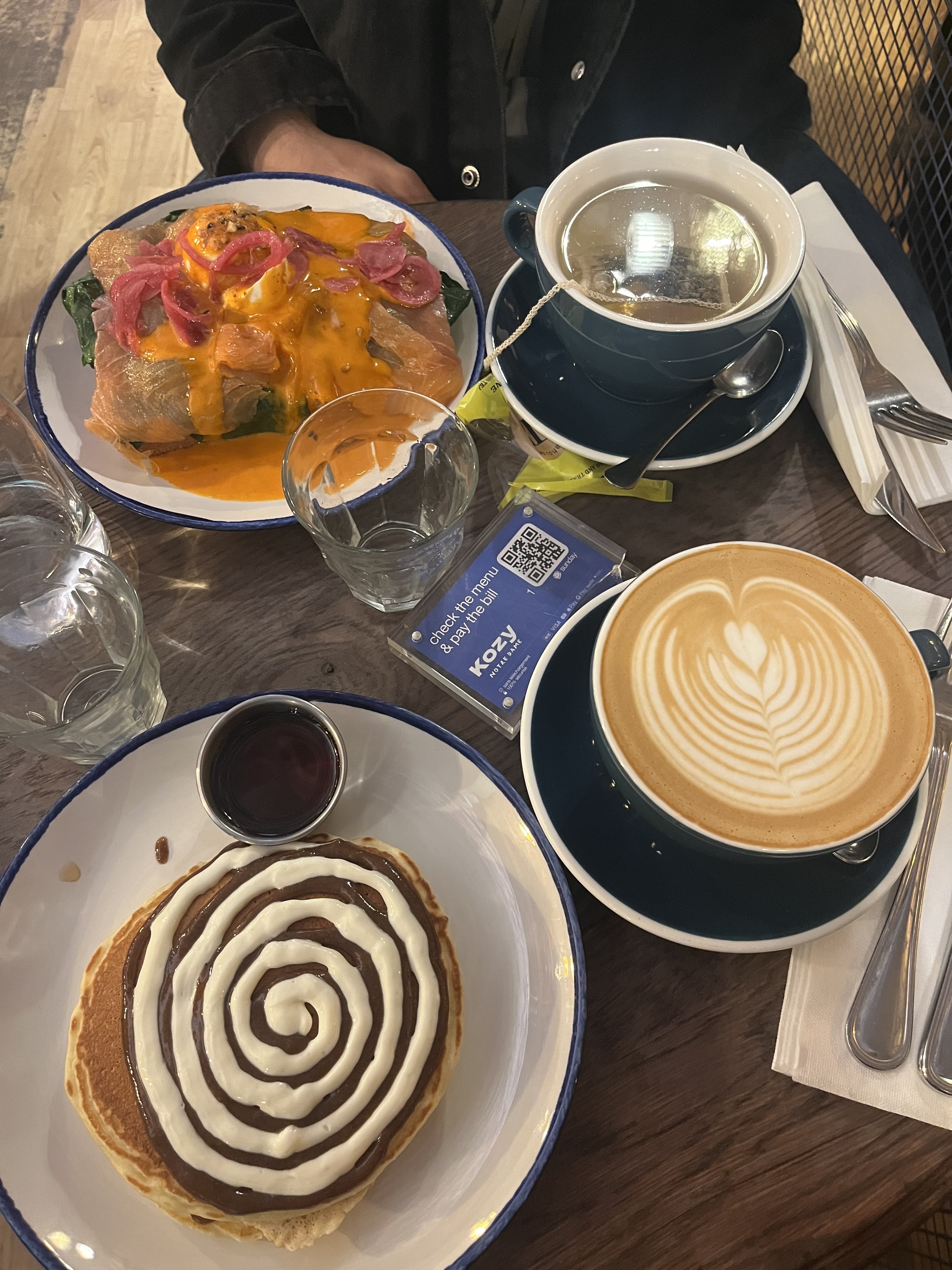 Super coin brunch dans un environnement chaleureux et un emplacement idéal. J’ai commandé des pancakes, un chocolat chaud et un smoothie. Tout était parfait, attention par contre…GROSSE portions, vous ne ressortirez pas affamé ! Je trouve même ça plutôt bien quand on vient pour le tourisme…3 repas par jours sur Paris c’est un peu cher, alors manger chez Kozy, ça nous donne de l’énergie pour toute la journée. De plus, mon serveur, Tom il me semble, était très agréable et professionnel. Ils avaient l’air tous très aimable d’ailleurs. Mon service était rapide et sans aucun problème. Je recommande absolument !
