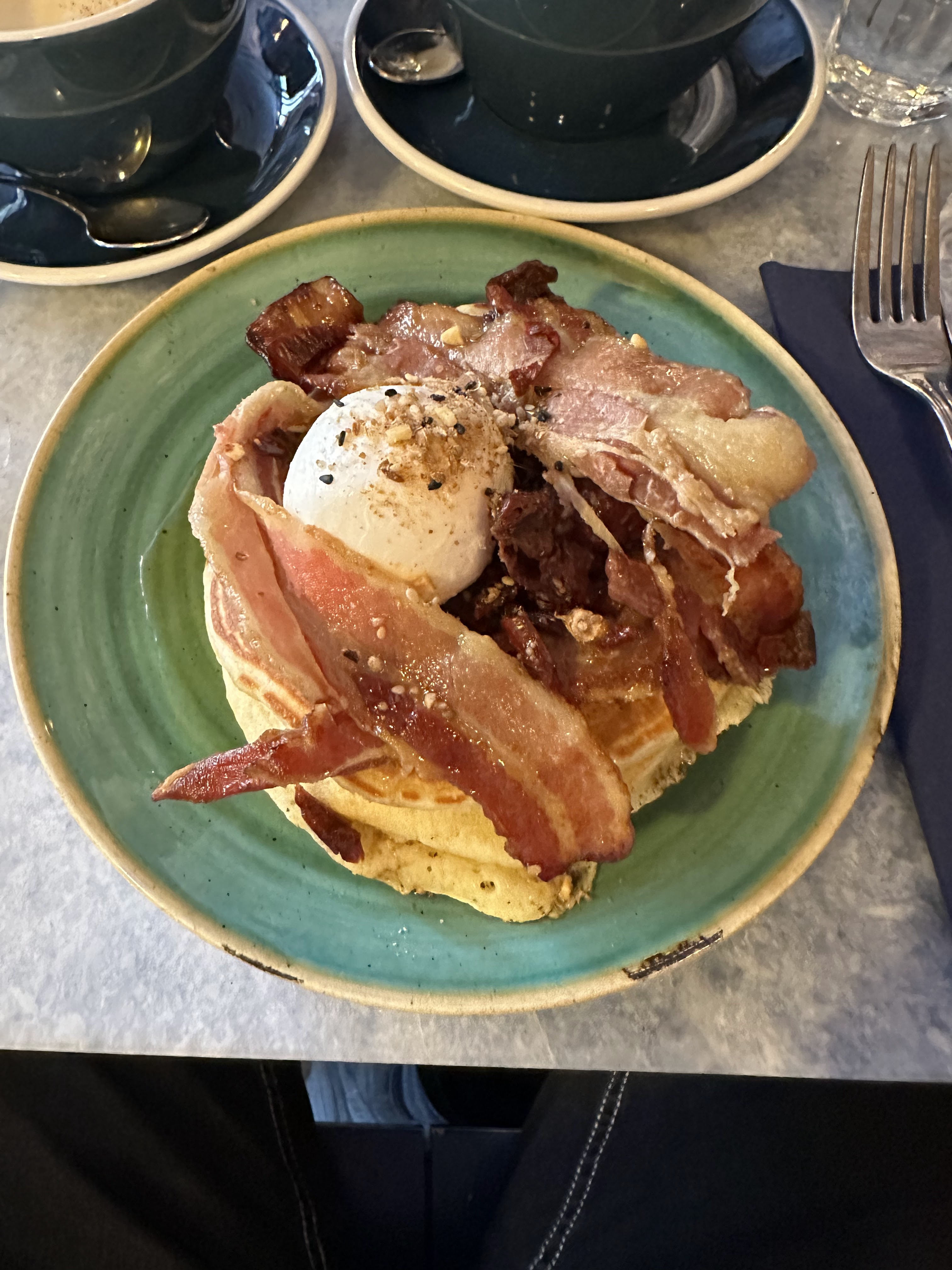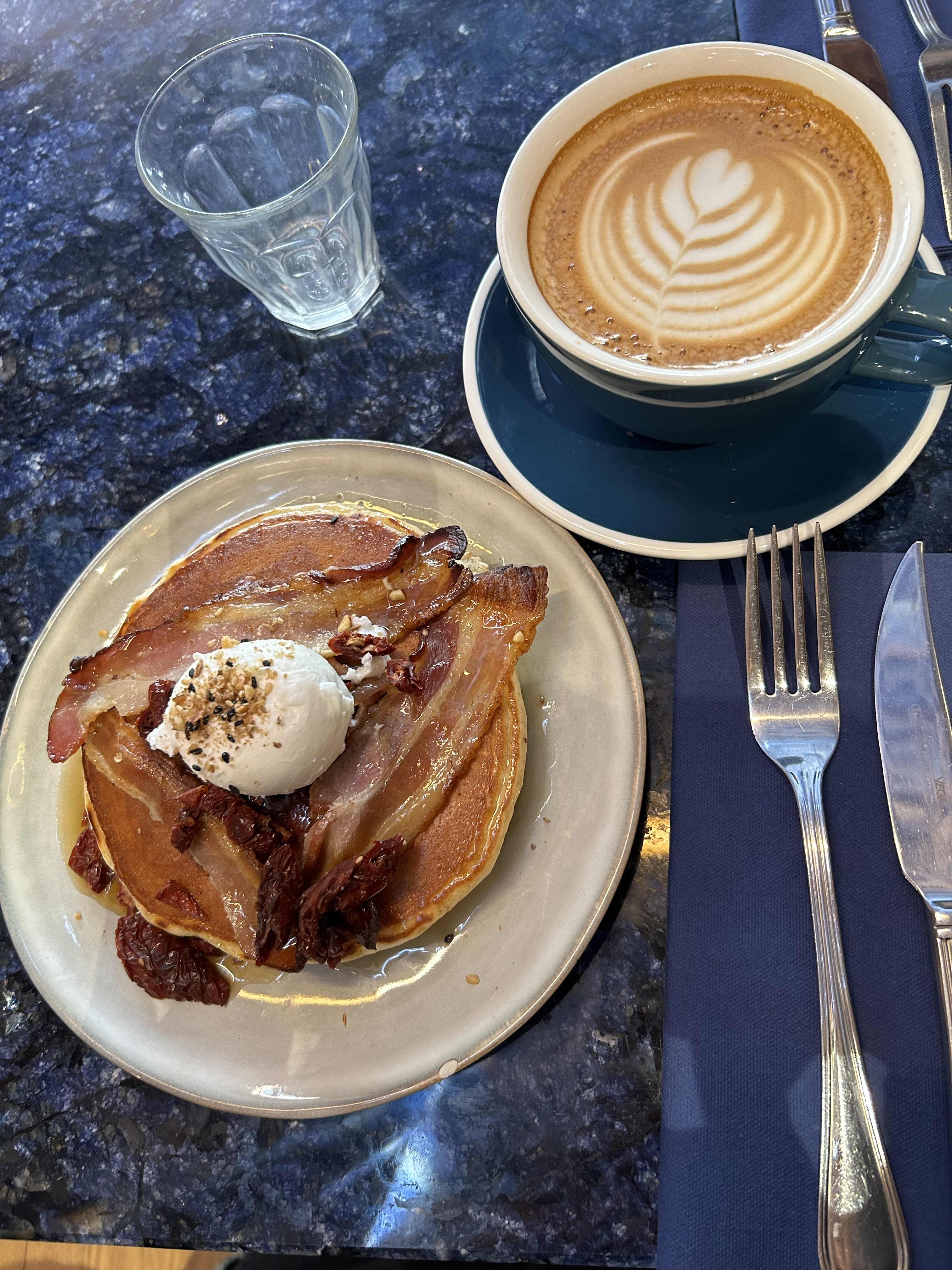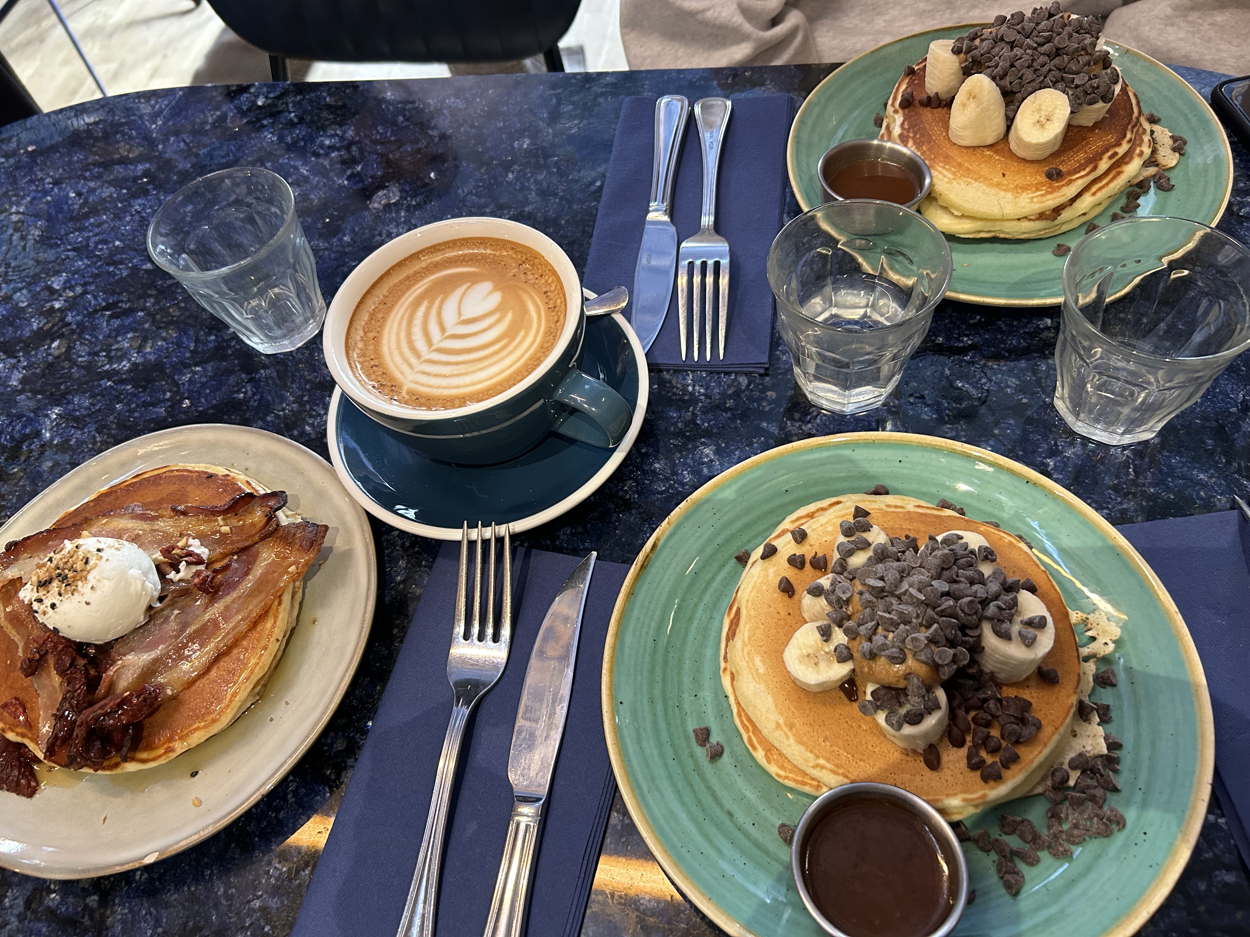 Toujours un sans faute, cela fait un moment que nous connaissons l’enseigne et nous ne sommes jamais déçu. Si vous voulez un très bon brunch à un prix plus que correct vous êtes à la bonne adresse. Nous avons pris 3 pancakes avec bacon et œufs pochés et sirop d’érable et un toast à base d’avocat et de halloumi, en boisson nous avons pris un café latte et un chai latte.