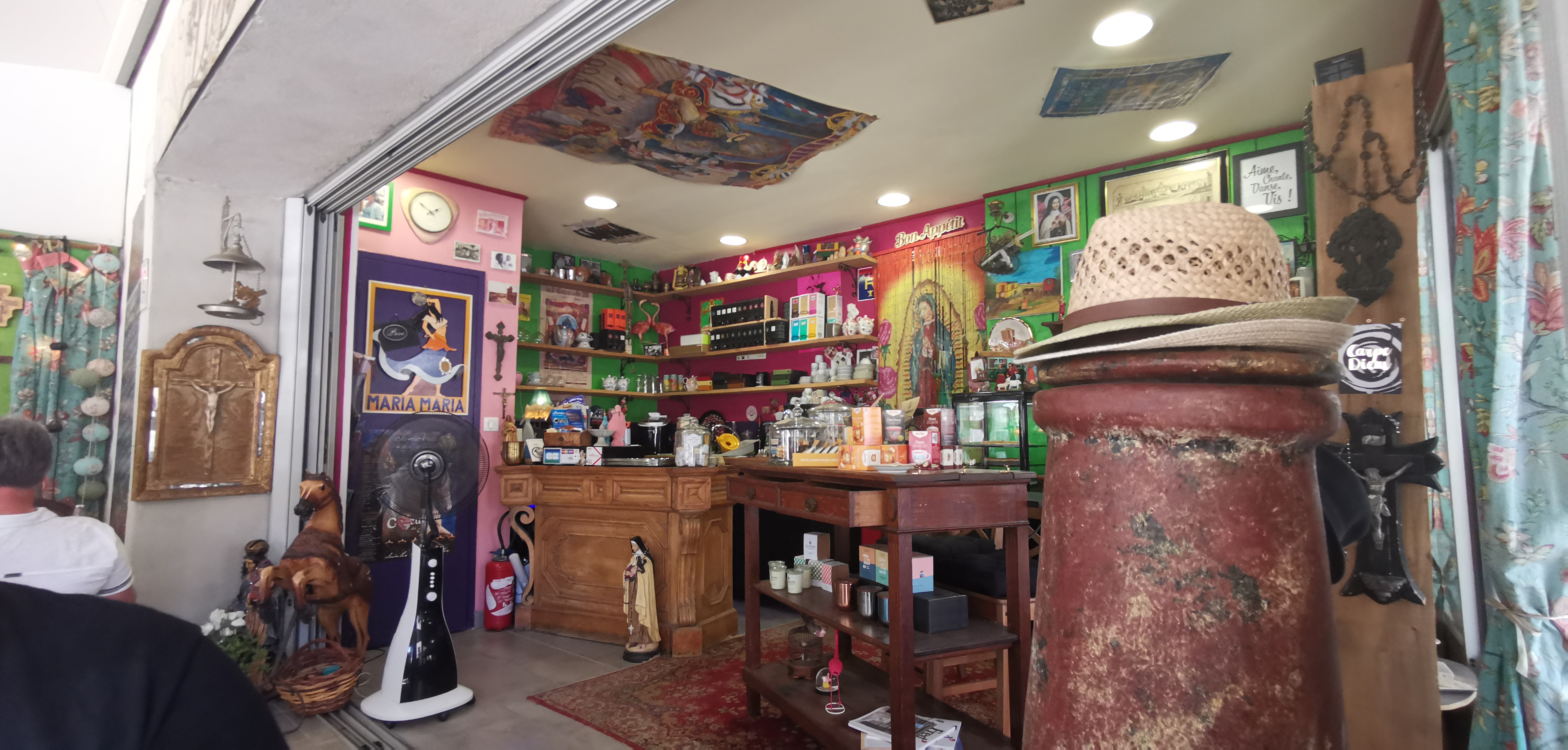 Heureusement que l endroit est décoré d une façon un peu originale 3 chapelets et un peu de couleur , car au niveau de l accueil et de la gentillesse ZÉRO !!! Pour la nourriture et l espace shop impossible à dire je me suis fait remballer , c est bien le tourisme qui vous fait vivre pourtant