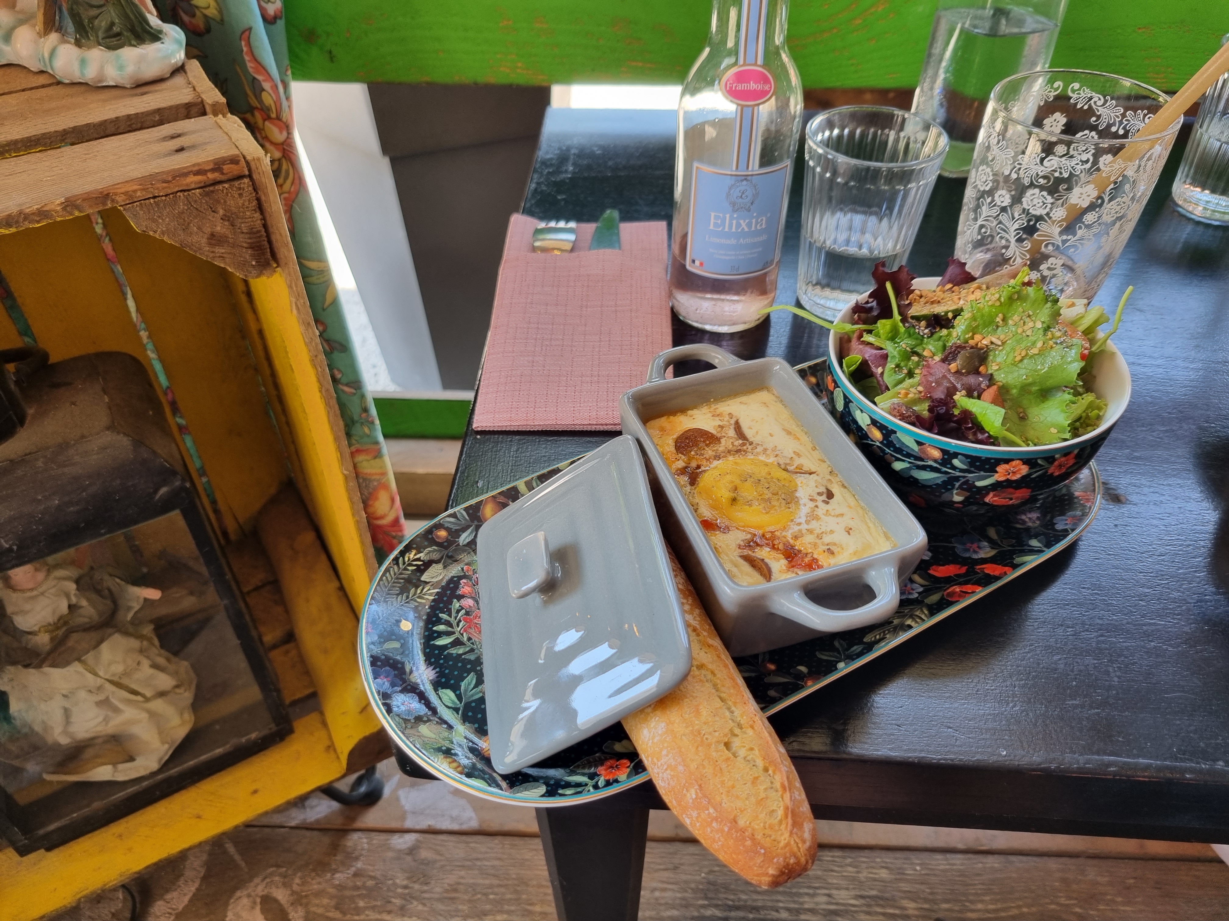 Petit brunch très très sympa autour de 2 versions de l'œuf cocotte préparé par Julie, dans un endroit merveilleux ambiance bohème gypsi ! 🤩😋 N'oublions pas non plus l'accueil tout en délicatesse que vous réservera Françoise 🥰 Au pied de la célèbre église des Saintes Maries 🙏 Nous reviendrons, c'est promis...