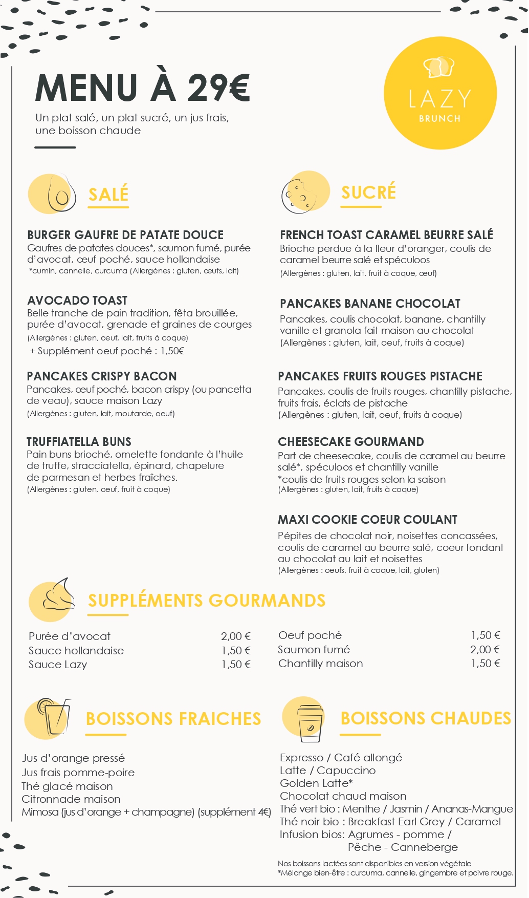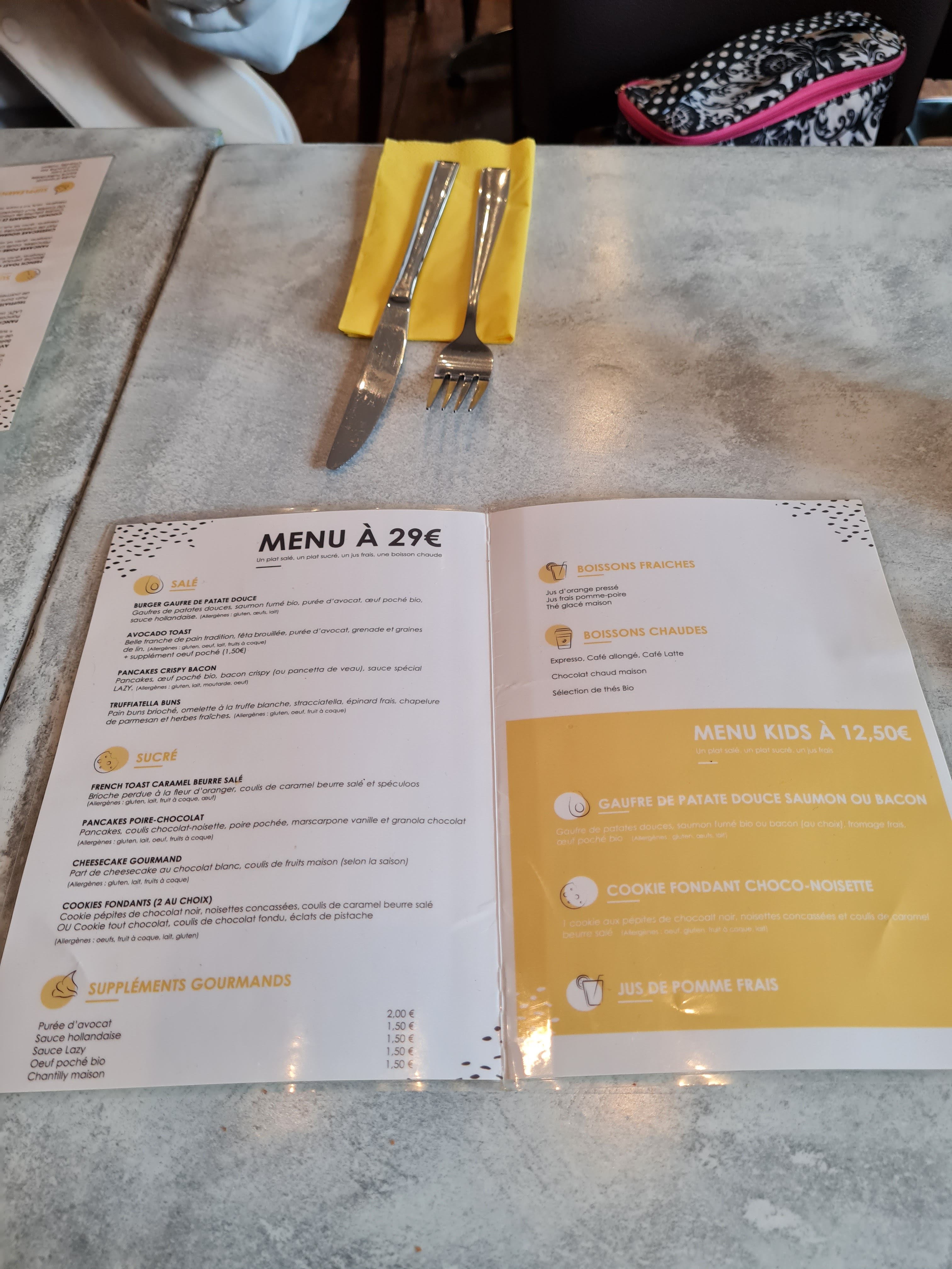 Bonjour Ji, Merci beaucoup pour vos compliments sur notre personnel. Je ne manquerais pas de leur communiquer :) Le prix du menu est en effet de 29€ (prix indiqué lors de votre réservation et à l'entrée du restaurant.) Pour ce qui est de la température des plats, j'étais sur place et vous m'en avez informé. Nous vous avons alors resservi de nouveaux plats à la température que vous souhaitiez. J'espère que votre prochaine expérience chez Lazy brunch vous satisfera pleinement. Nous concentrons nos efforts à tout faire pour que ce soit le cas, Juliette