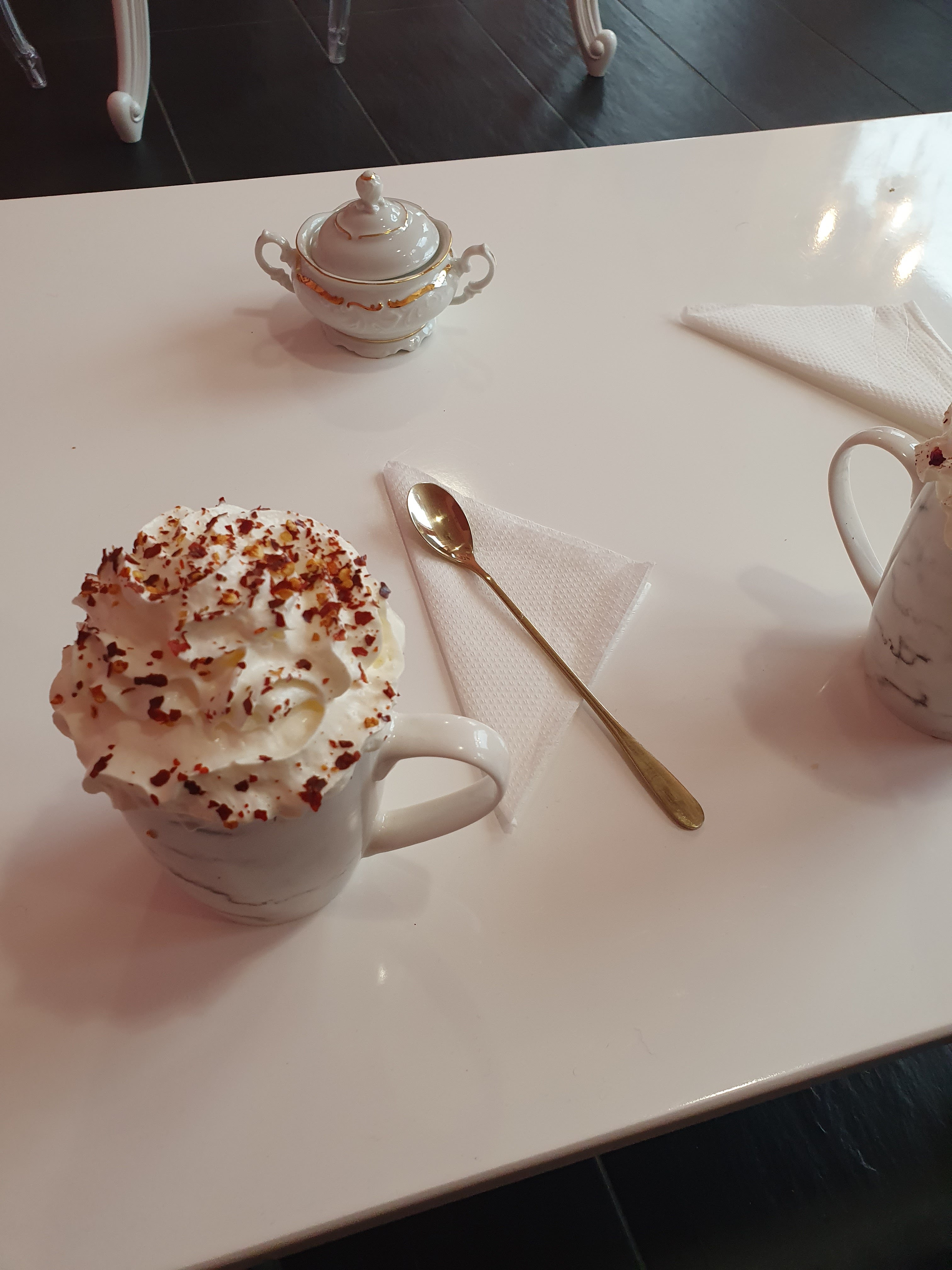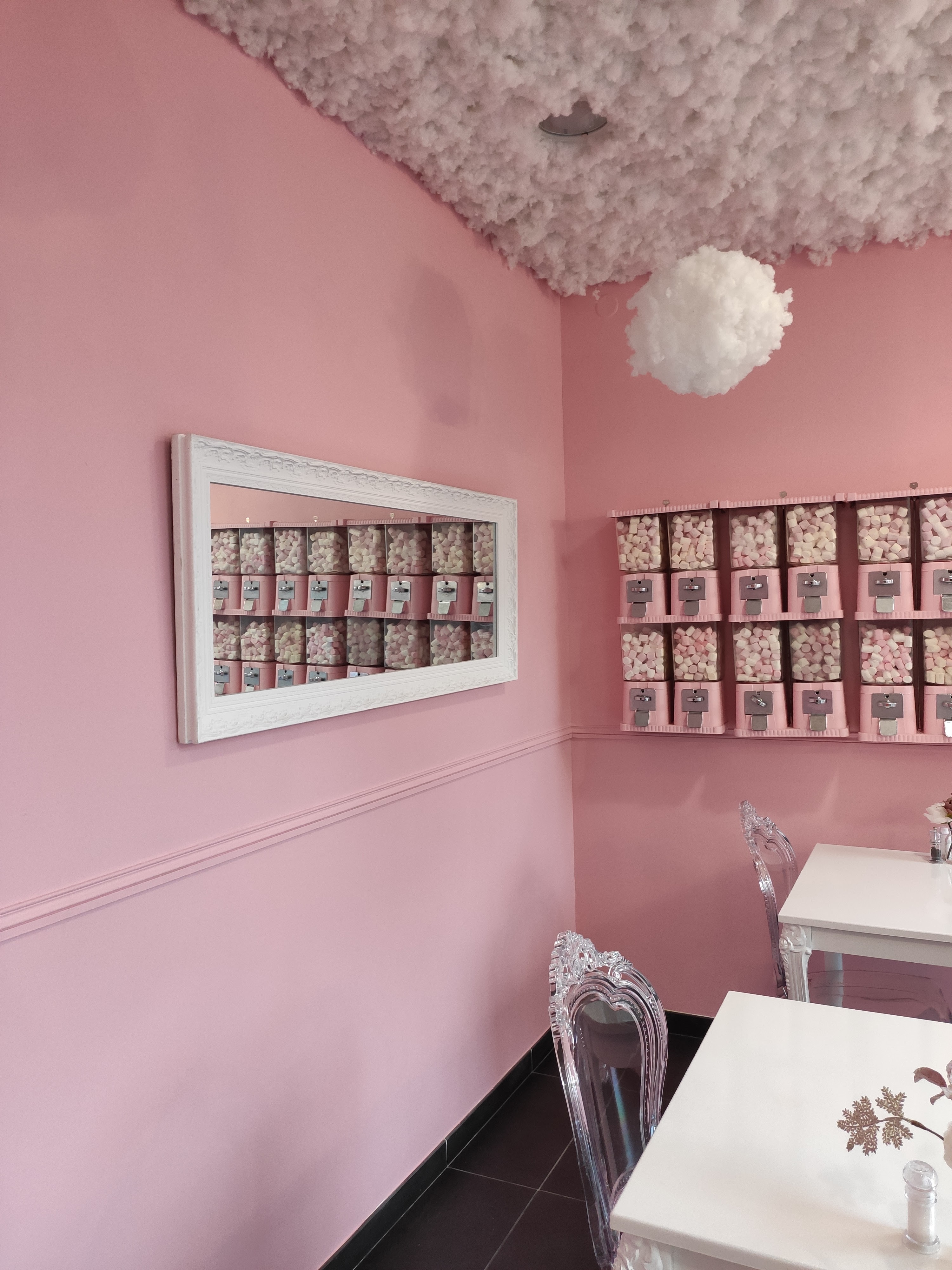 Un décor psychédélique pour un dépaysement garanti. Entourés de rose et de nuages, de chammallows dans de vieux automates , de tables et chaises en verre...on sirote notre chocolat chaud rose. En vrai, les tables et les chaises sont en plastique, le chocolat chaud blanc est aromatisé à la rose, sous son gros nuage de chantilly, parsemé de pétales de rose séché. Un vrai délice ! Le chocolat chaud cannelle pointe de piment est très déstabilisant et révolte les papilles. Mais finalement très bon, puisque je rêve d'y retourner ! Malgré un choix très restreint de gâteaux et un service terriblement long, je recommande! Nous avons passé un bon moment , les gâteaux sont très bons :part de birthday cake speculoos, part de fraisier et gros macaron au Nutella . J'encourage l'équipe de travailler sur la rapidité du service pour que tout soit parfait.