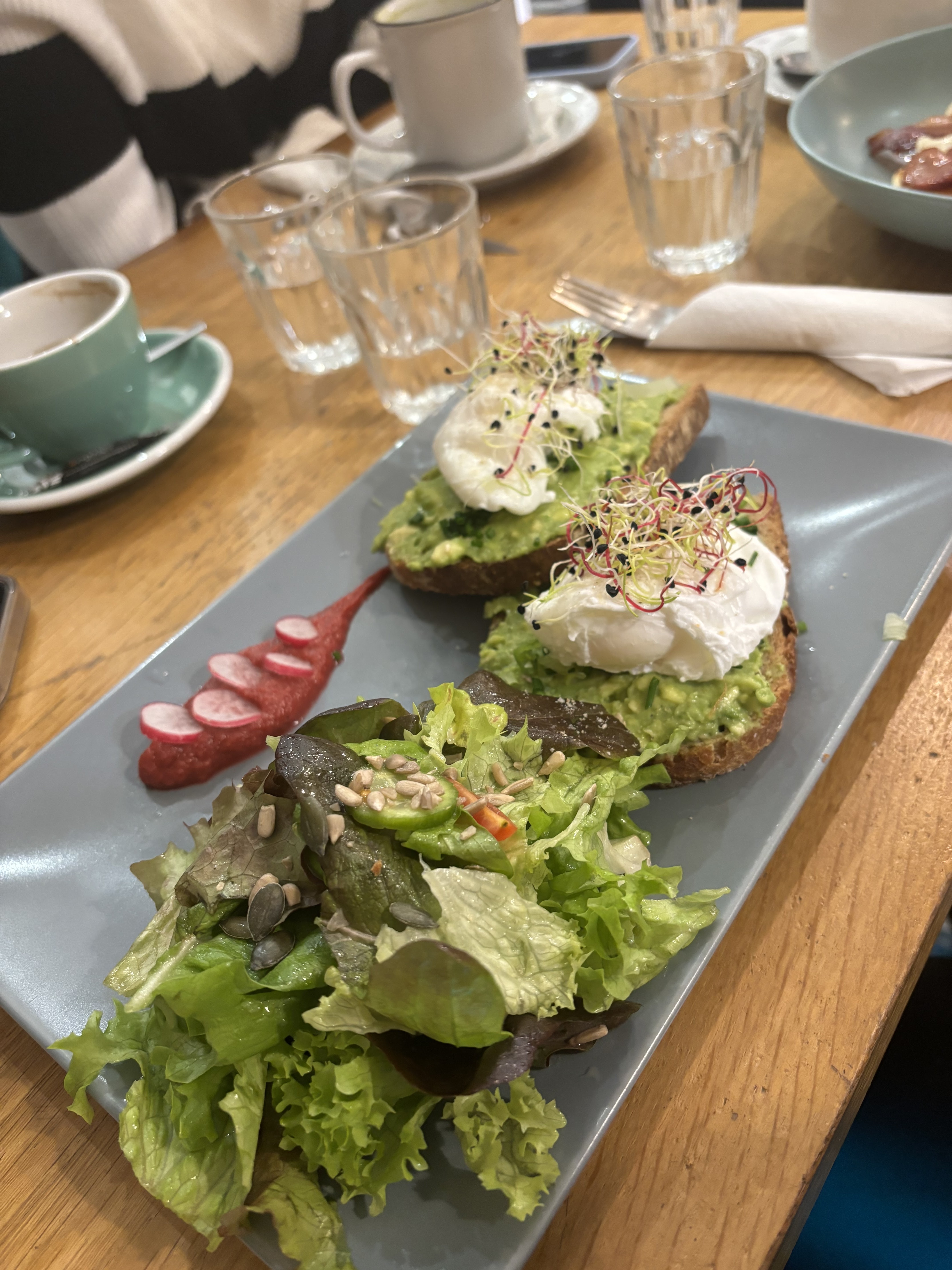 De délicieux toasts à l'avocat. Nourriture bien présentée. Endroit petit mais superbe. Le café était bon mais il semble que des grains de Robusta soient utilisés