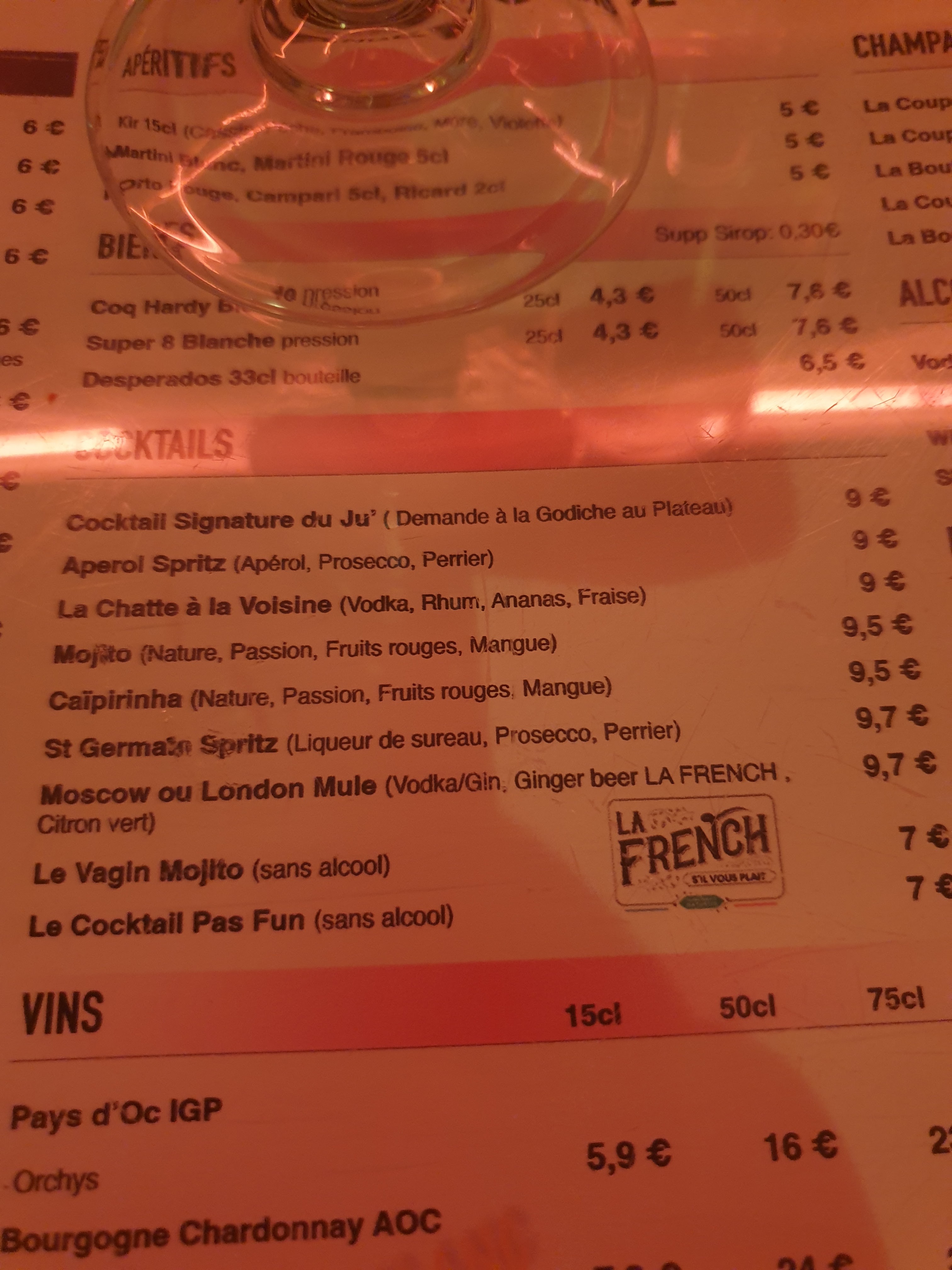 Très beau moment passé au Ju'! D'abord un accueil téléphonique très sympa (à savoir, pas de réservation), et au resto, tous les serveurs sont top !! Une carte très variée et amusante pour des mets très bons ... et pour un total plus que raisonnable!! Tout ça fait du bien quand on connaît les excès de Paris! Le Ju' mérite vraiment le détour quand on visite le Marais ...