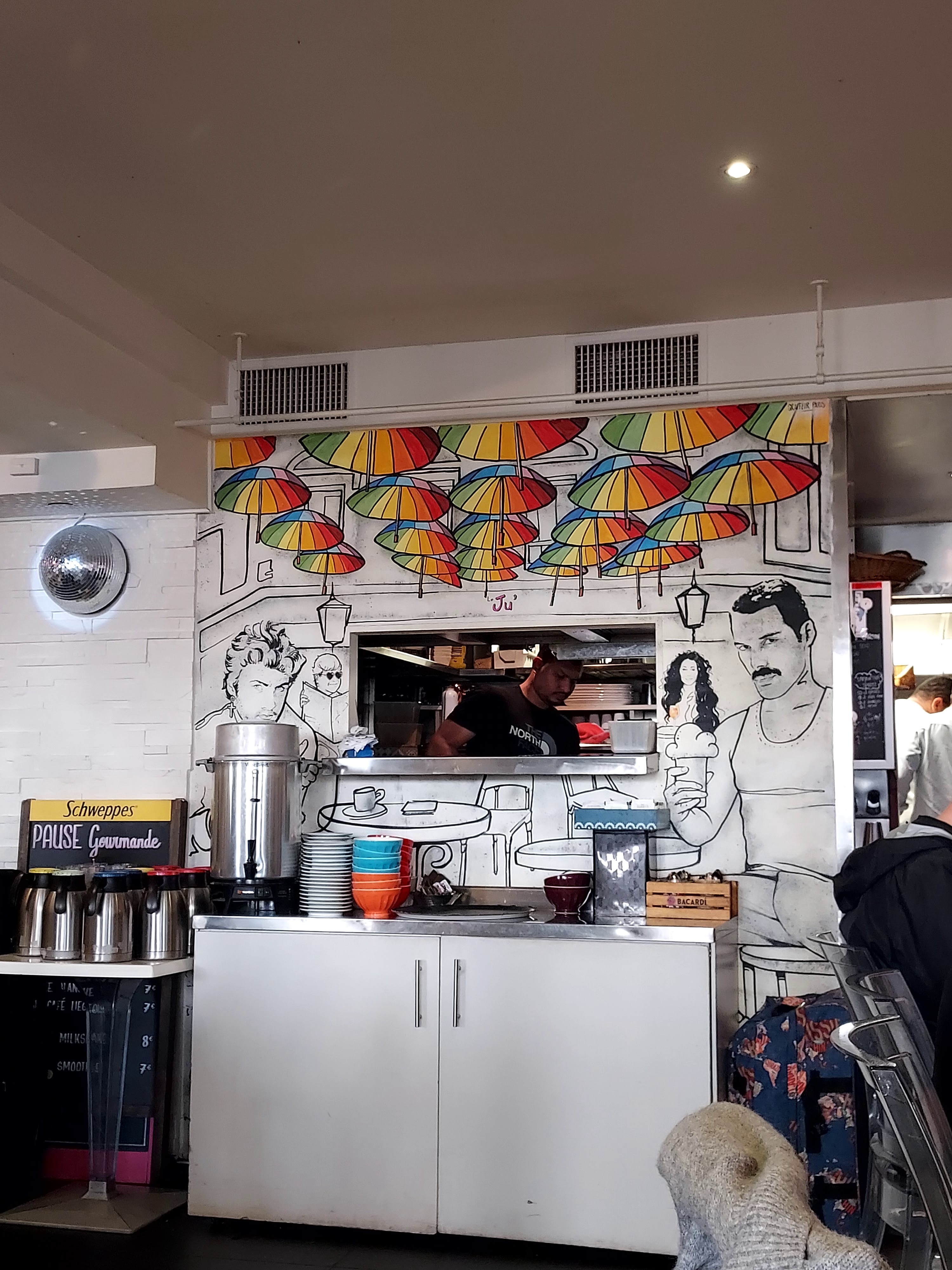 Les serveurs étaient très sympathiques, et j'ai beaucoup aimé le décor avec les arcs-en-ciel. Les places sont un peu serrées cependant. J'ai pris une tartine healthy qui était très bonne et mon amie s'est pris un brunch qu'elle a bien apprécié (oeufs brouillé, coquillettes, salade quinoa, burger, pain, viennoiserie, dessert pistache aux graines de chia), même si elle a été un peu déçue par le burger.
