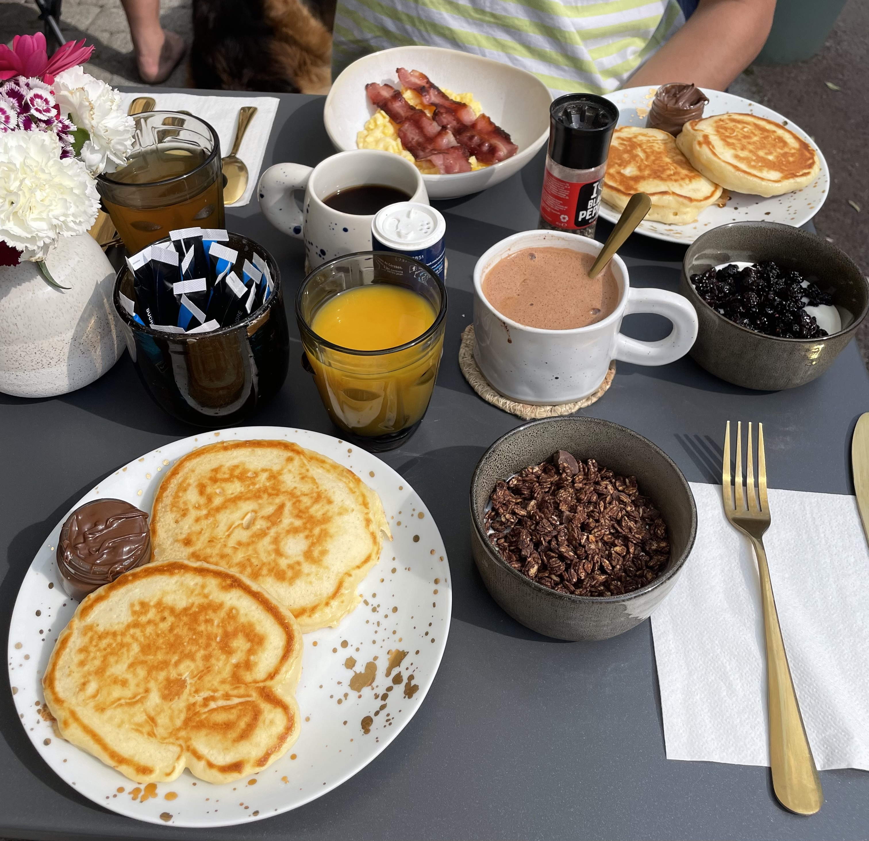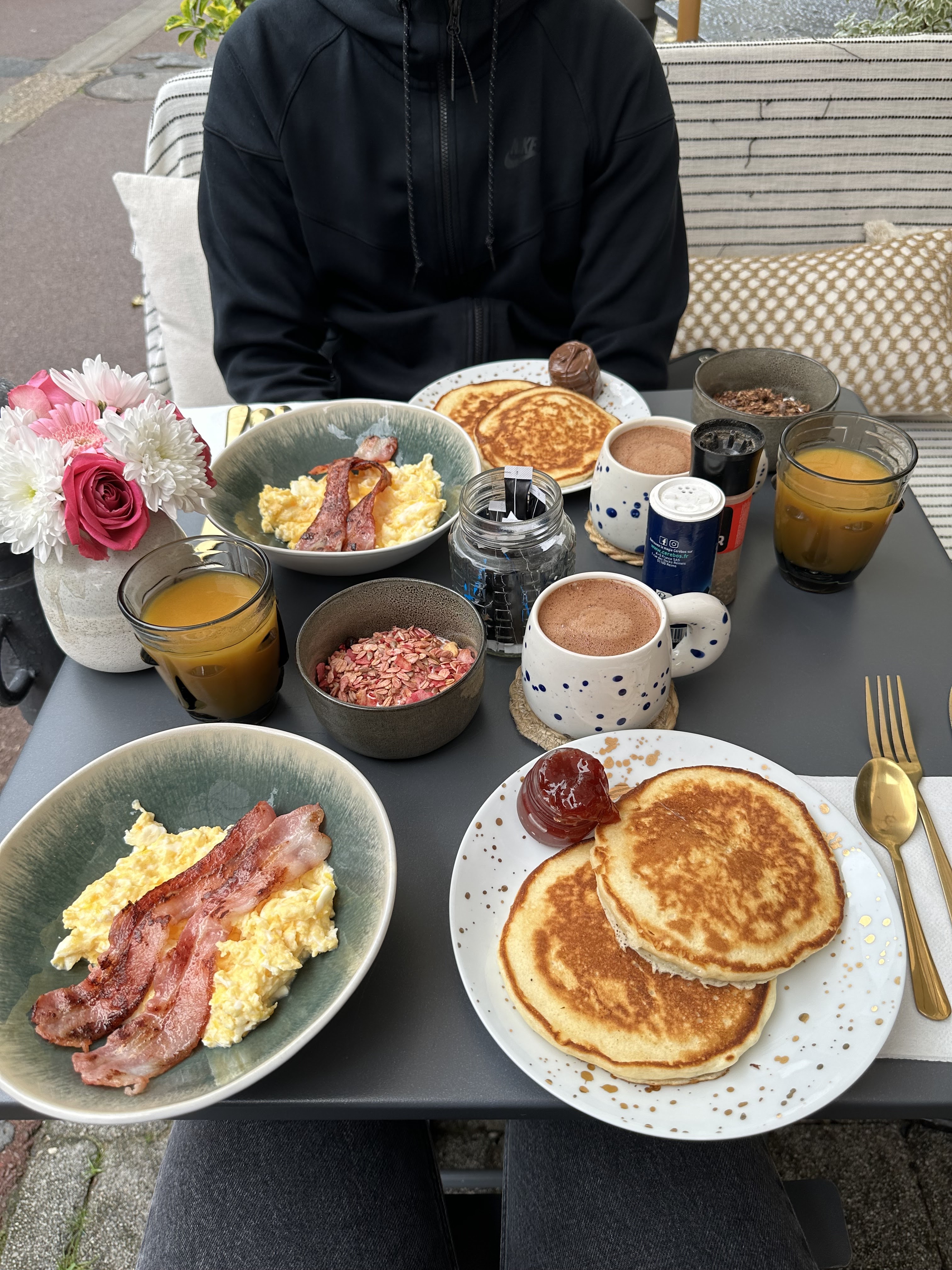 Merci pour l’excellent bagel et le café sur la belle terrasse. Merci aussi pour l’attention aux détails de la vaisselle et pour les pancakes au miel ! Ma fille les a dévorés.