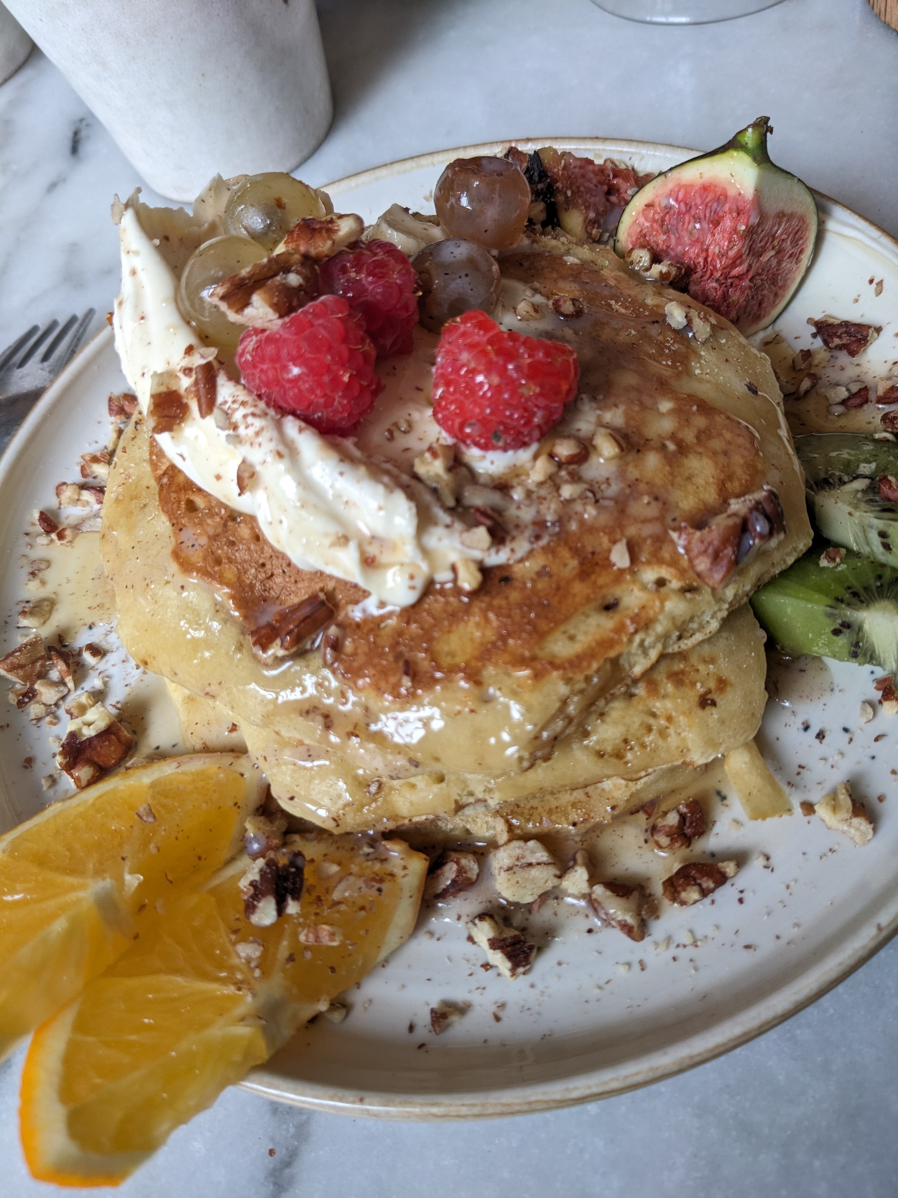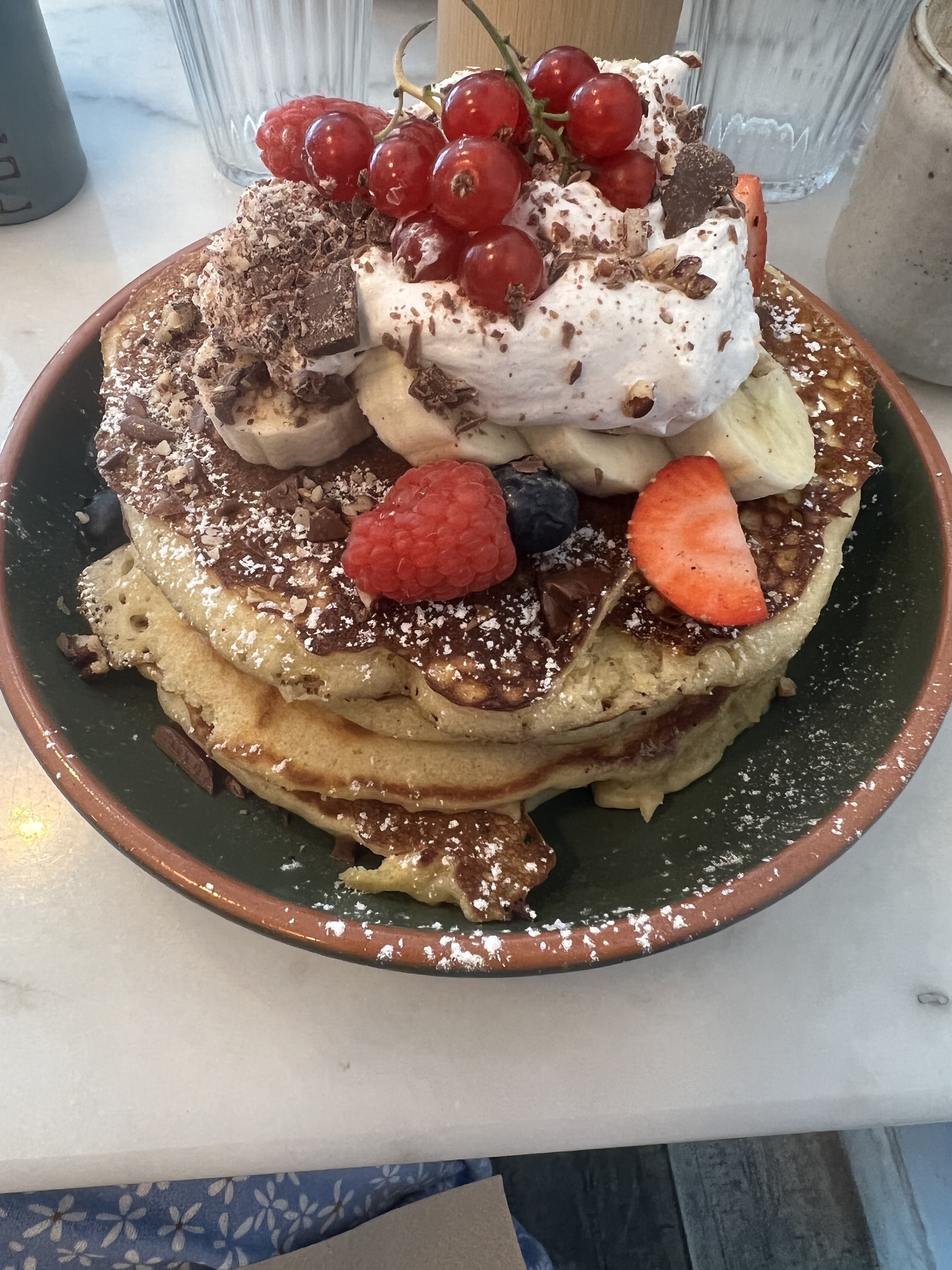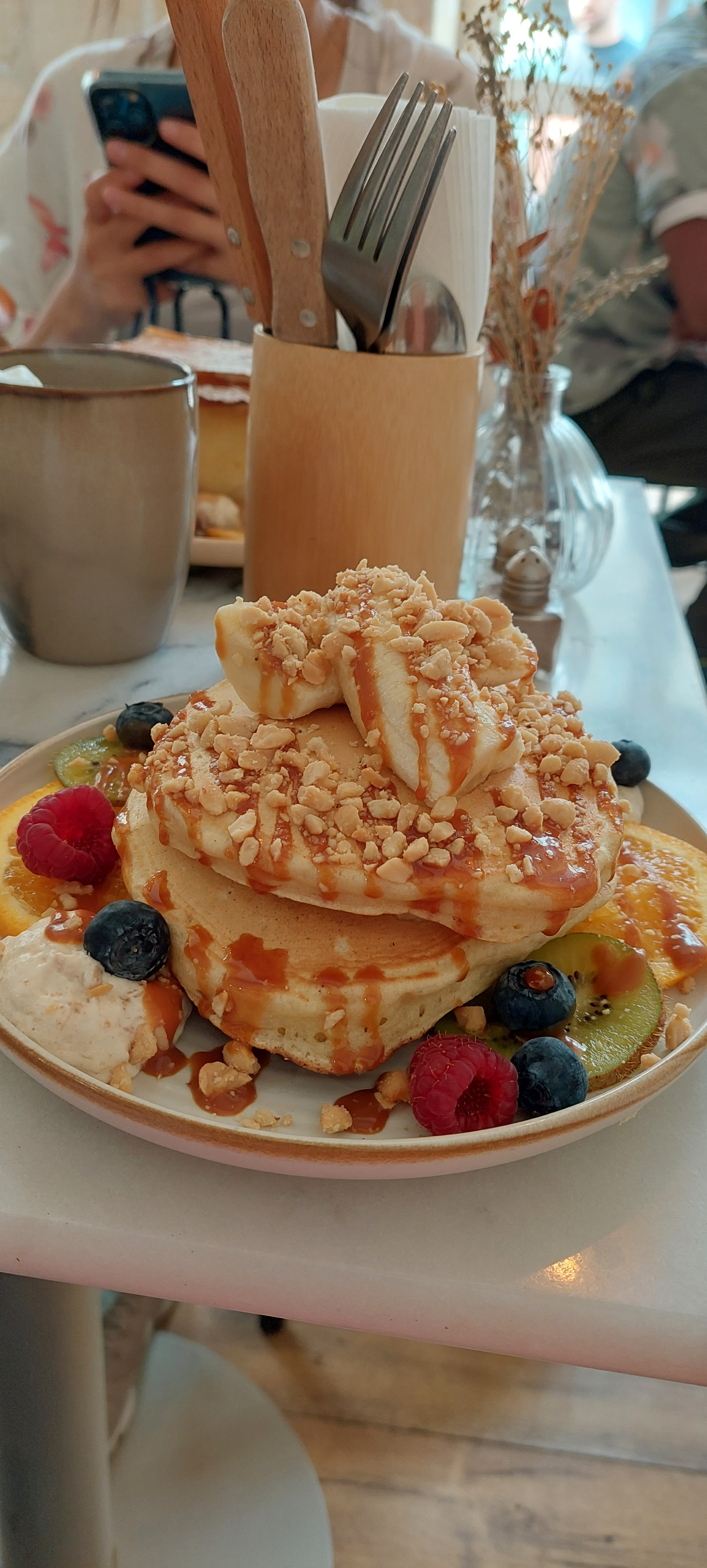 J’ai bien aimé le pancake, le goût y était, vraiment bon, cependant, quantité disproportionnée, comme vous voyez sur la photo, 4 énormes pancakes couvertes de chantilly, c’est bien, mais il faudrait une sauce sirop d’érable ou chocolat proposé comme partout, autrement il était sec et là si vous la voulez il faut payer un supplément. Je trouve dommage, car j’ai payé un supplément pour une cuillère de sauce chocolat , mais je n’ai pu manger qu’un pancake et demi, donc plus de 2 pancakes est parti à la poubelle, c’est 15 euros pour une boisson chaude et un pancake donc. Tout simplement du gaspillage et ça c’est juste pas possible a nos jours!! Vous payez surtout l’aspect esthétique de l’endroit et des plats ( pancakes servi dans une assiette trop petite, jolie, mais encore une fois, disproportionnée) car il y a pas bcp de choix, œufs brouillés, viennoiseries etc.. je n’ai pas vu. Je n’ai pas non plus aimé le service. Enfin, il y a d’autres cafés assez sympa dans le coin, qui eux, proposent des vrais brunch pas instagramables, mais très bon et a des prix corrects.
