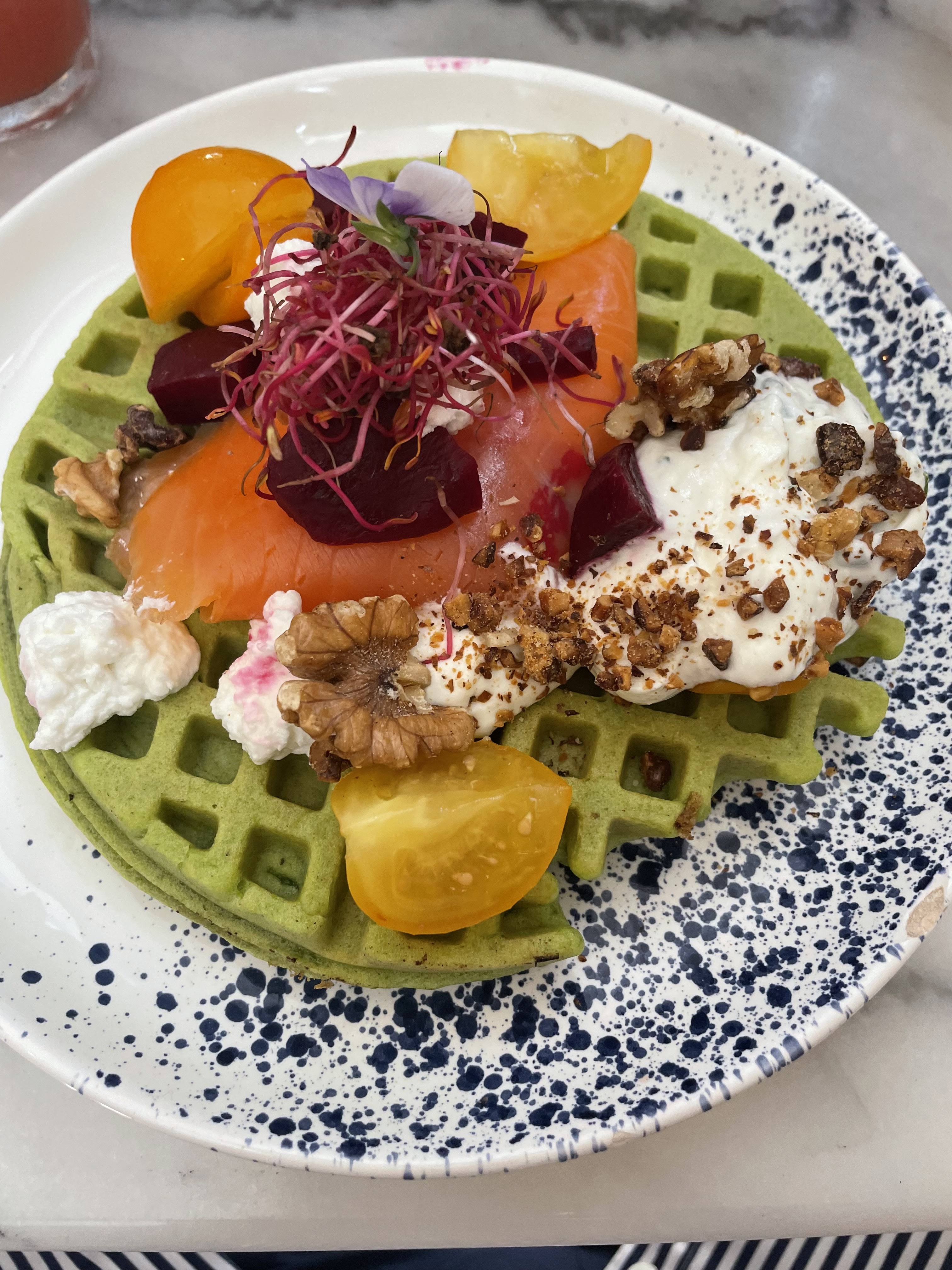 Un super brunch généreux, avec des produits frais et de qualité. Choix de plats VG et sans gluten. La gaufre à la fleur d'oranger est sublime 🤩, ainsi que le dirty chai !