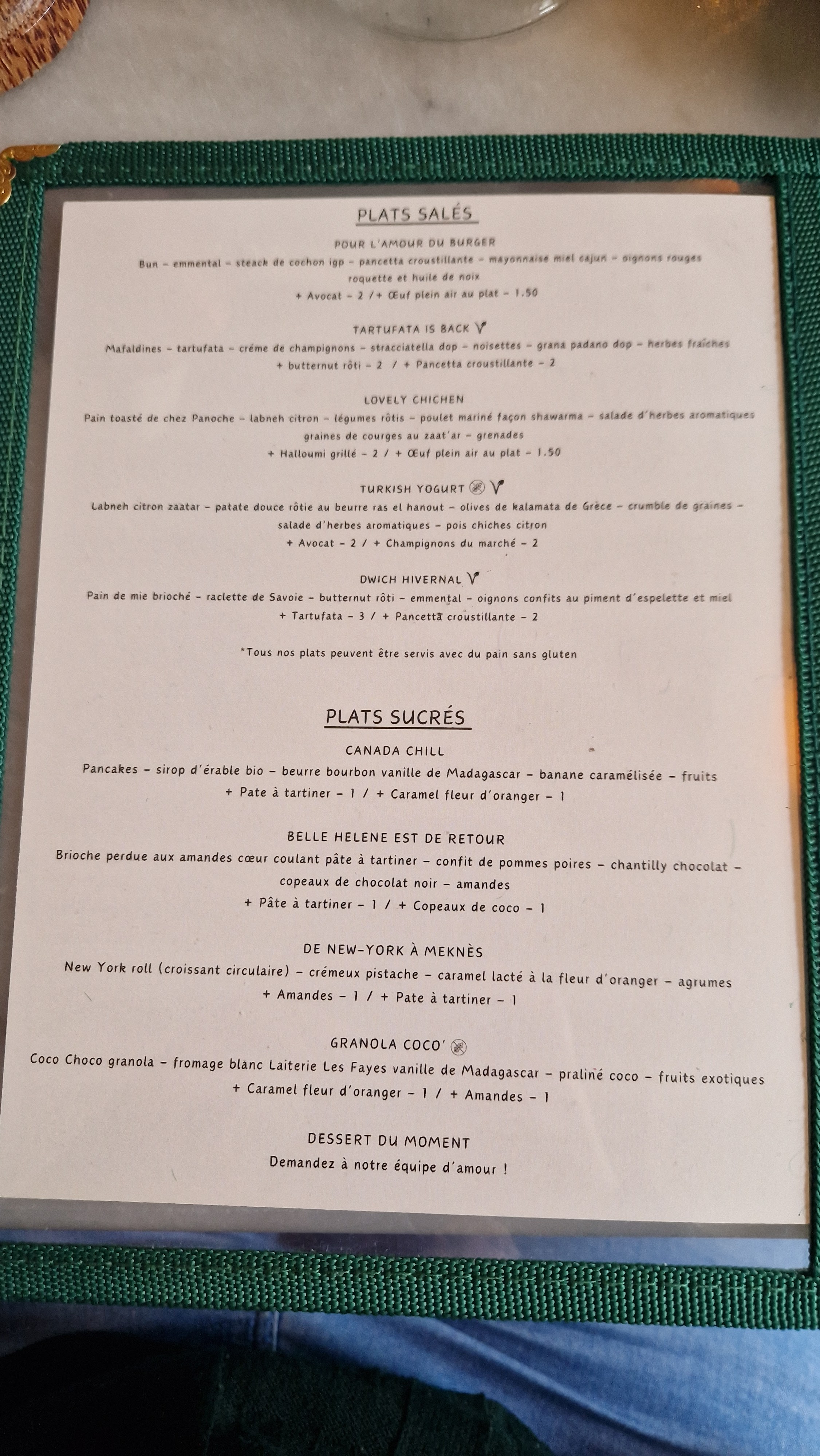 Super brunch ! Des recettes originales ! Mention spéciale pour le tacos cartel poulet épicé et ses petits morceaux d’ananas ! Des plats sucrés gourmands ! Et une super ambiance un peu californienne en déco !
