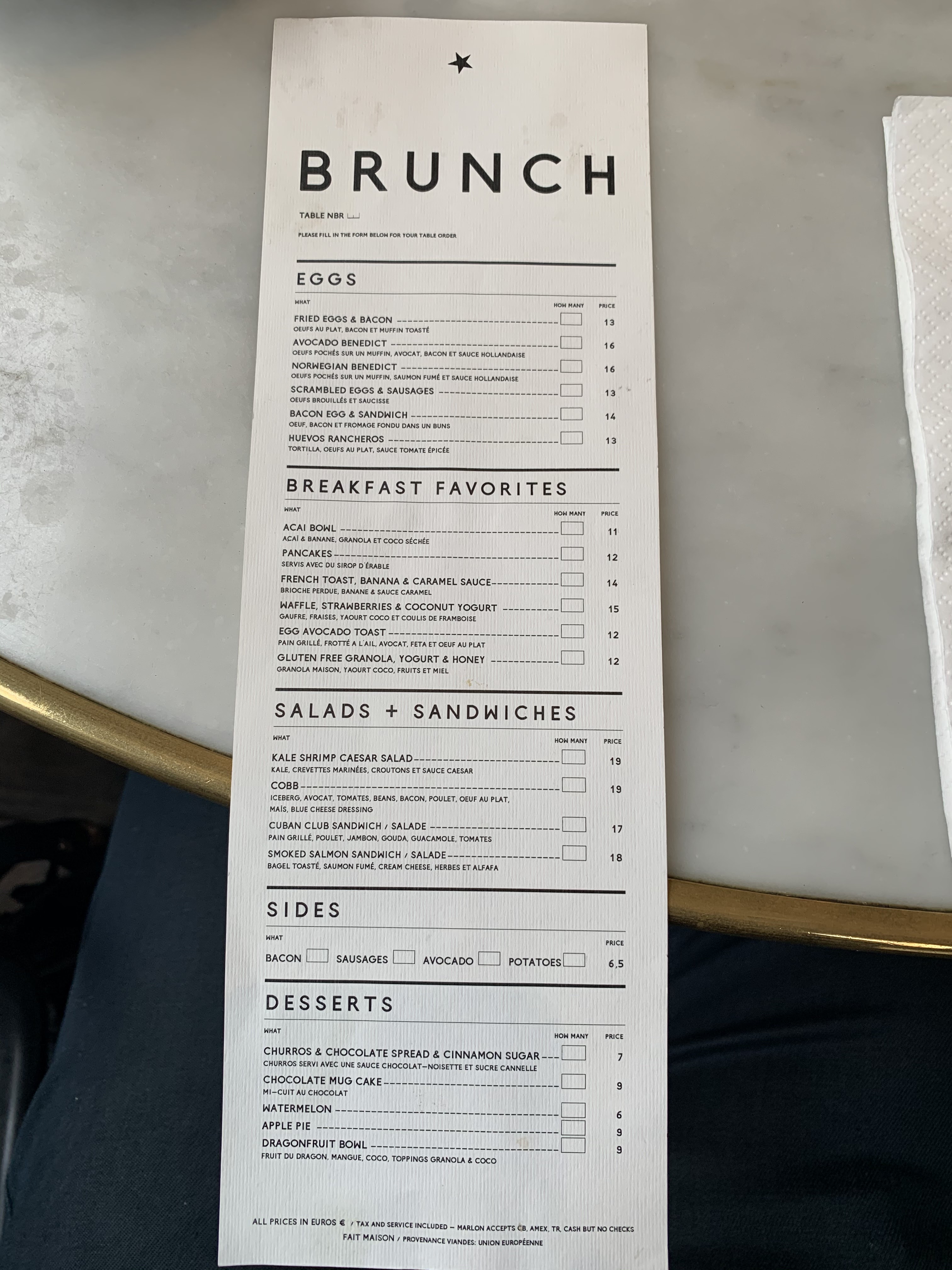 Très bon brunch sur Paris. Les produits sont de qualité et le service top. Il faut compter une trentaine d'euros par personne.