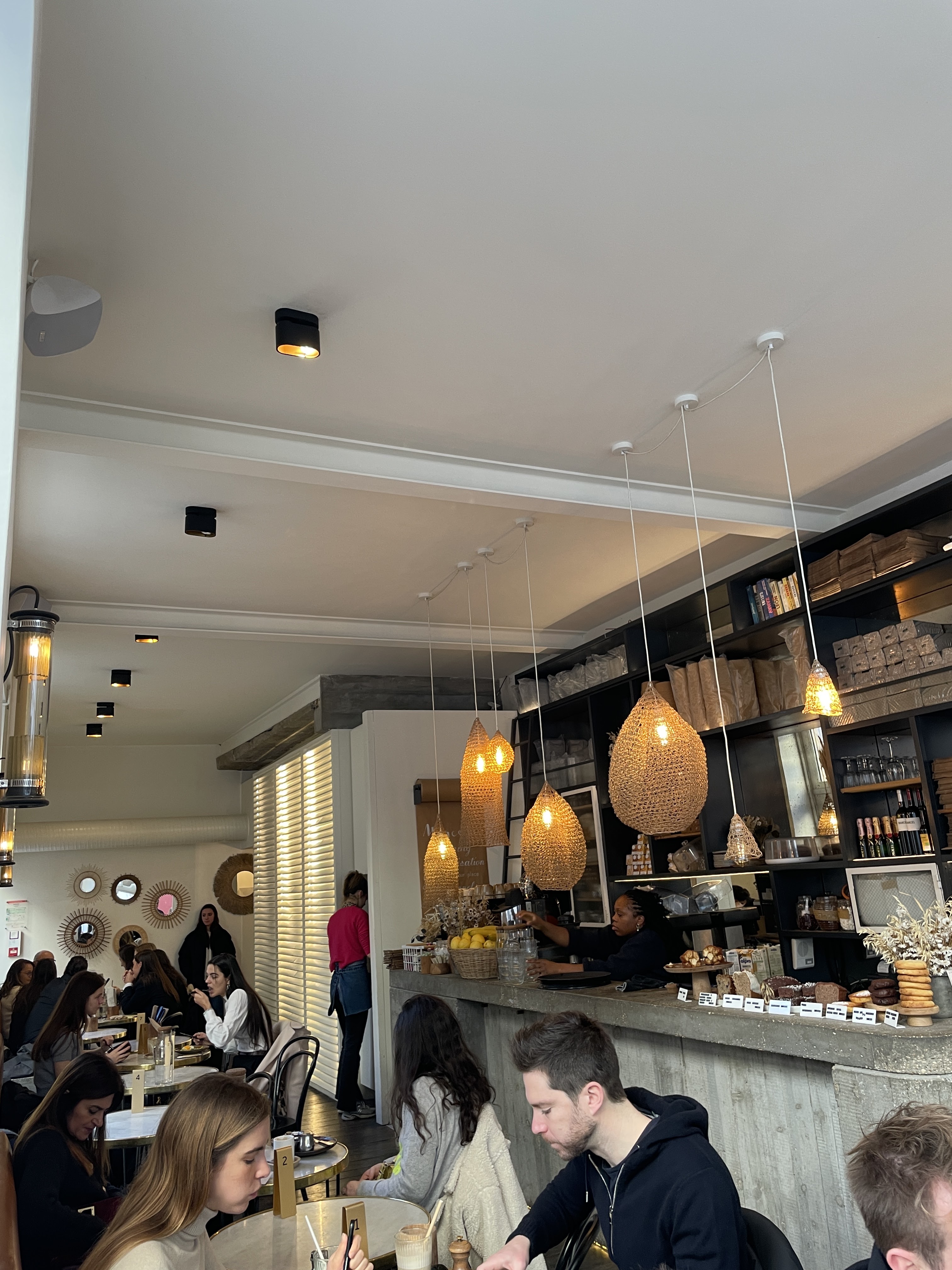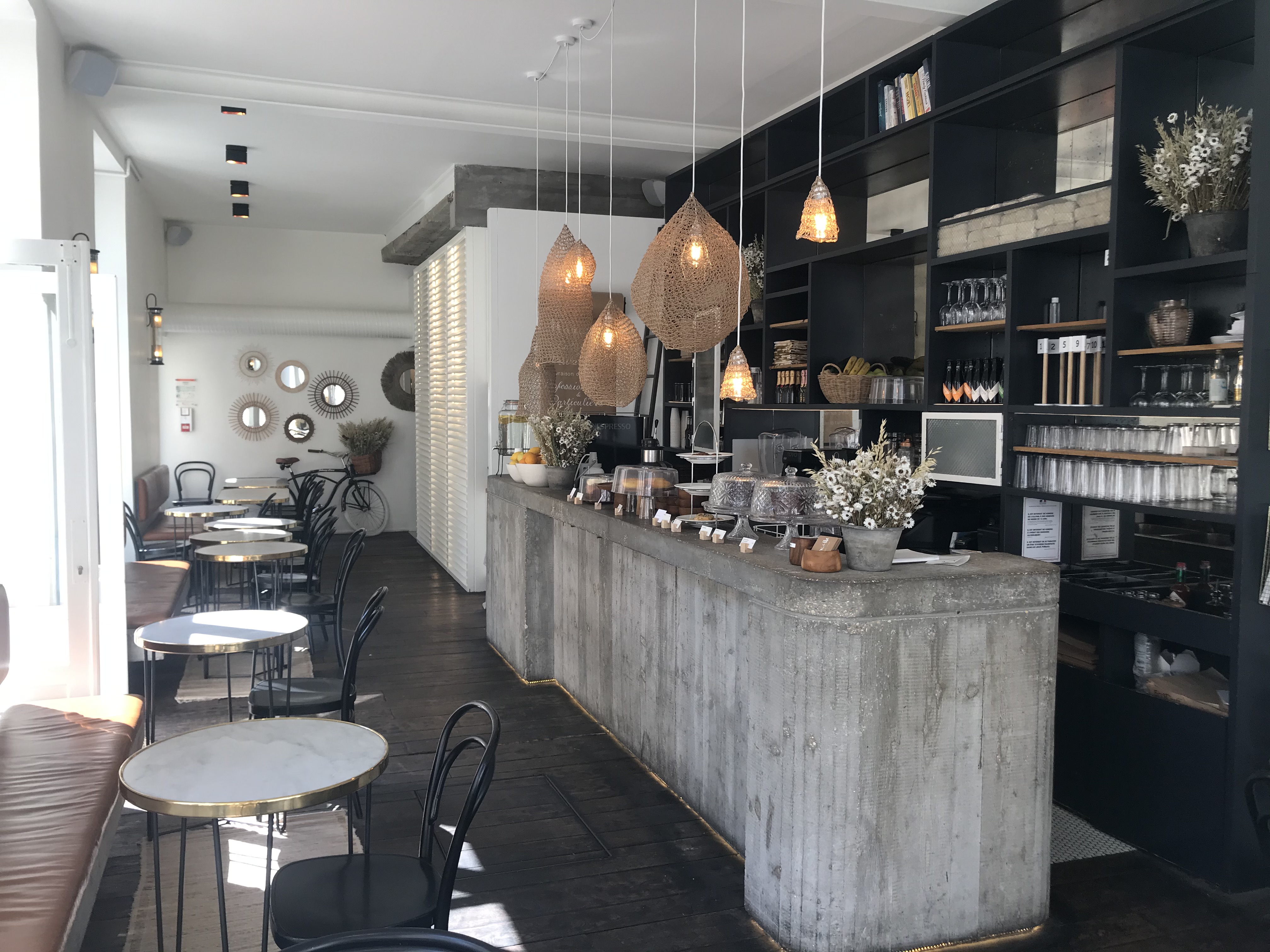 Un lieu qui se veut branché mais trop petit à mon goût,du coup les tables de 2 sont toutes collées les unes aux autres donc on oublie l'intimité pour les conversations... Quand nous y sommes allés, il y avait des travaux dans la rue. Rajouté à ça le bruit des machines à jus et à café, ça fait vite cacophonie. Côté plat, c'était plutôt bon mais, au vu du prix, la quantité qu'il y avait dans l'assiette n'était pas à la hauteur. Tout comme le prix de l'expresso (3.50€ sans même un petit chocolat pour accompagner) ou de la gaufre (12€), ça a du mal à passer. Il faut arrêter d'utiliser l'excuse du quartier pour justifier des prix excessifs...