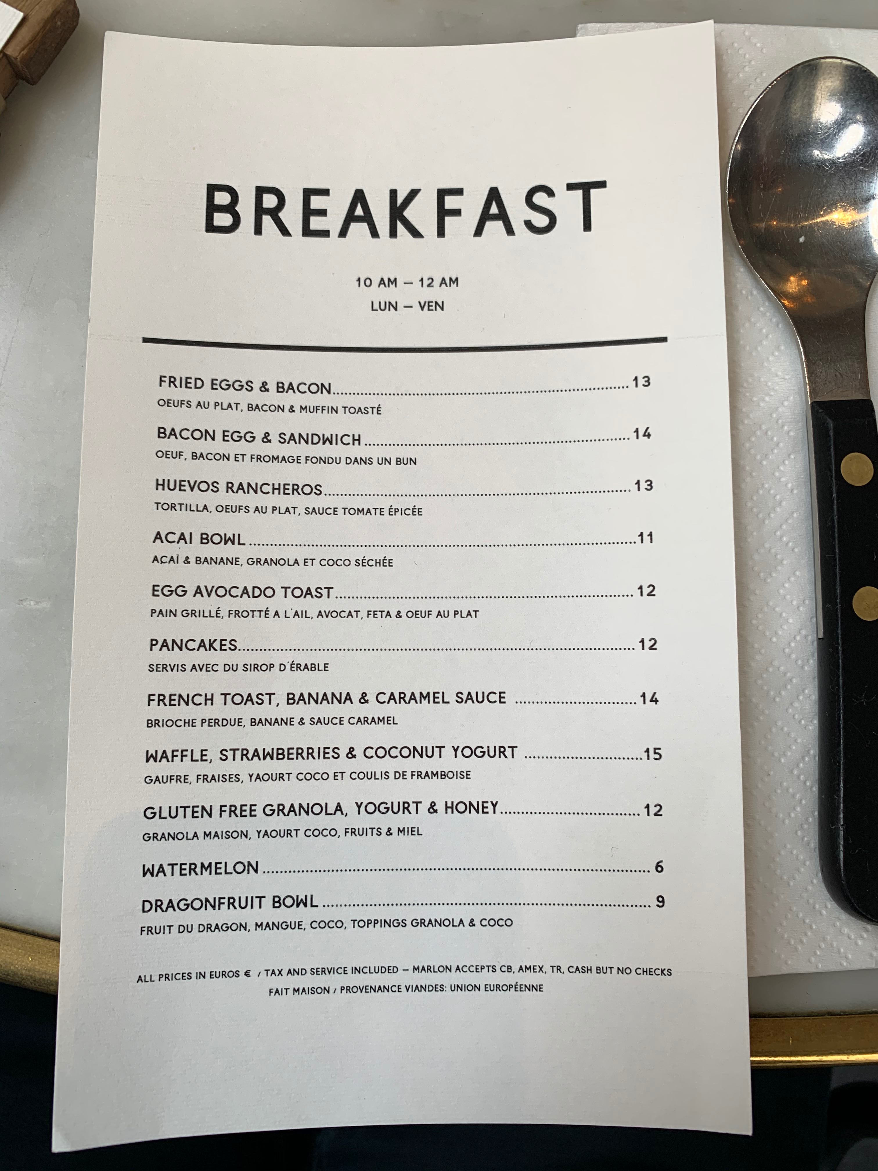 Je partage l'avis de Lisa Nguyen qui résume bien l'atmosphère sordide qui nous a envahi lors de ce brunch. Personnellement, je ne comprends pas les notes et avis des utilisateurs de Google. J'ai payé 14€ pour un bol de chips avec de la sauce un petit œuf, cela vaut 4 ou 5 étoiles ? Je me permet de revenir sur son commentaire et plus précisément sur le FRUIT SEASON BOWL qui se résume à 4 lamelles de pastèque finement coupé comme un jambon Serrano. C'est inacceptable de recevoir ça pour 7€ j'en suis tombé à la renverse. Un conseil si toutefois vous souhaitez y aller, il y a une porte au fond peu contrôler, idéal pour un resto basket. Pour le reste tout à été dit dans son commentaire que je vous invite à lire. Le Marlon est l'un des plus mauvais investissement que vous puissiez faire, parole de scout.