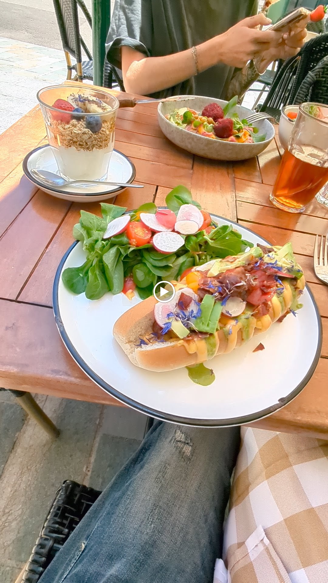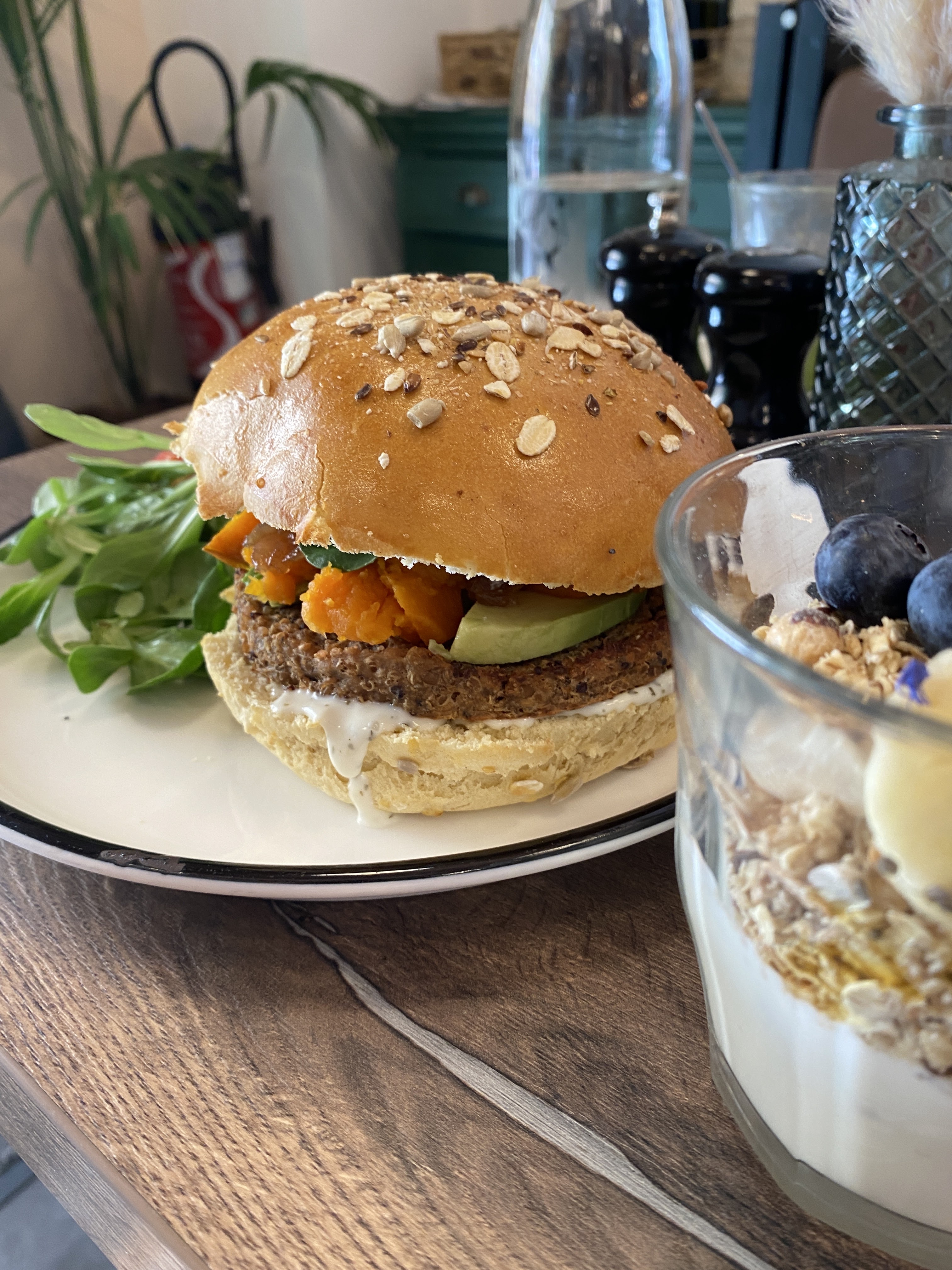 Pas de réservation possible pour le brunch. Belle déco, petite salle mais il y a des tables en terrasse. 26€ pour le yaourt, muesli et fruits + pitta végé (purée patate douce, haricots rouges, œuf, avocat, graines et une sauce ?) + thé glacé maison (hibiscus). Plus de place pour un dessert !