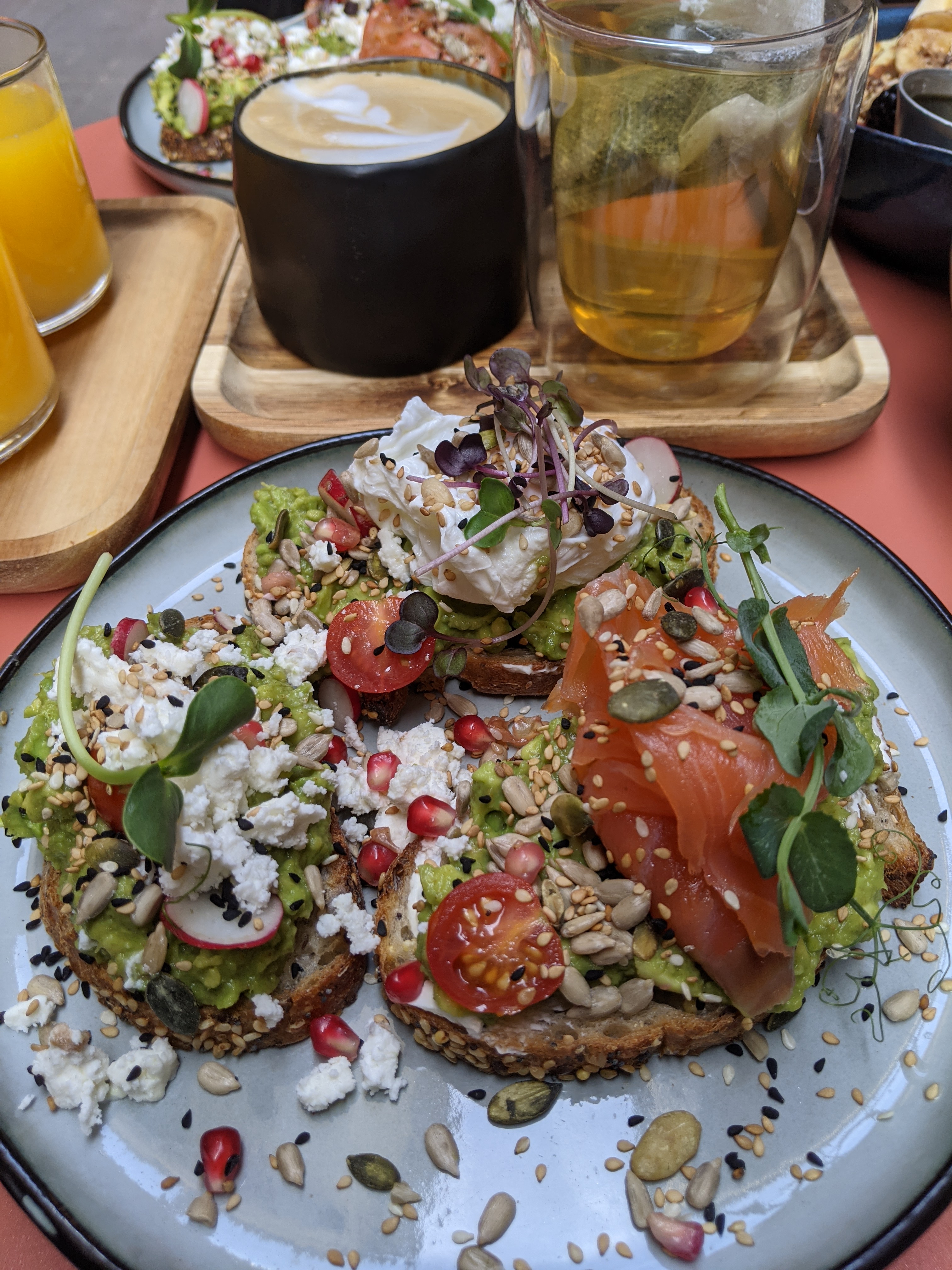 Tout simplement magnifique et gourmand. Nous avons pris turkish eggs et mix toast avec brioche perdue gourmande et granola aux fruits. J'ai été surprise par l'intensité du beurre de cacahuète 😍😍😍 et le houmous 😍😍.