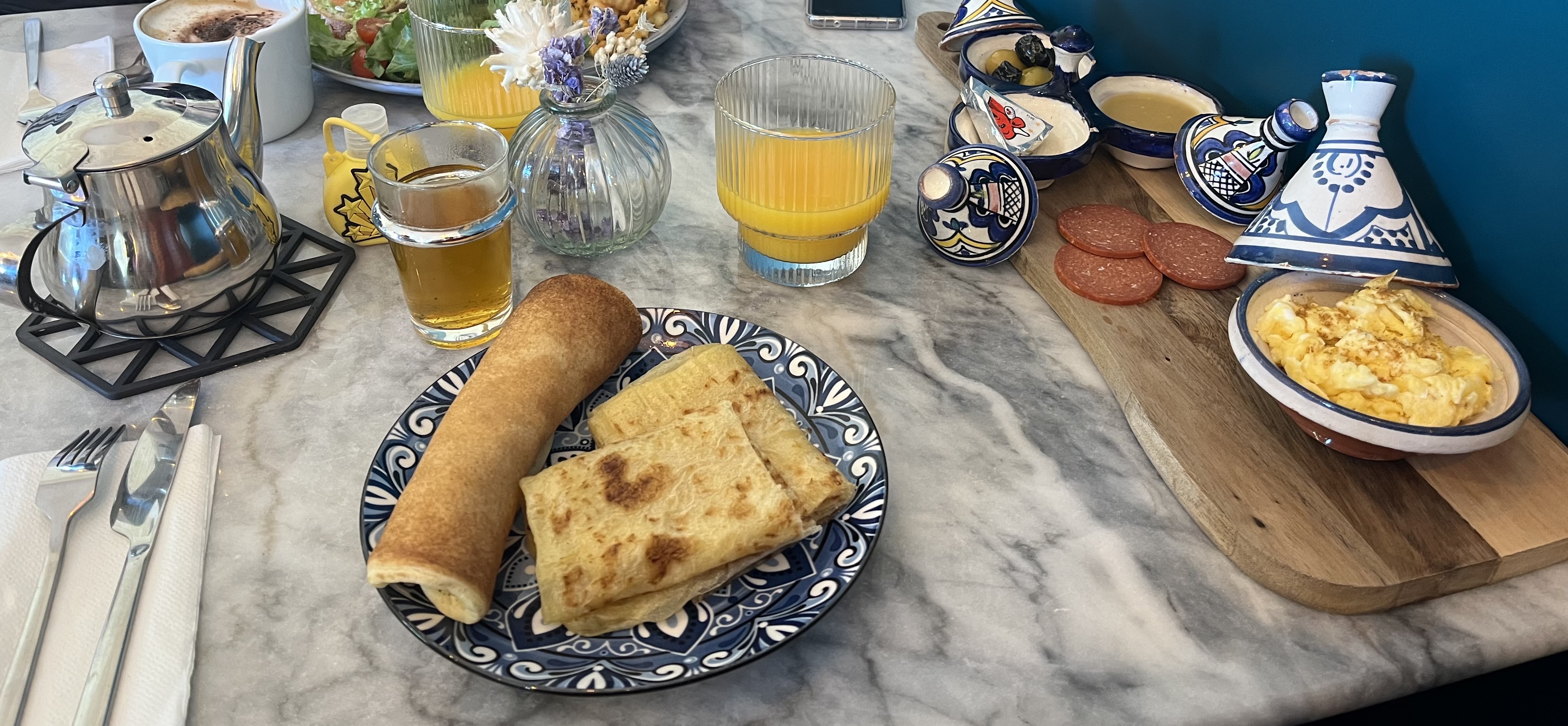Très bon brunch, mention spéciale pour les baghrirs, je n'en ai jamais goûté d'aussi bon, moelleux et imbibé d'une sauce à la fleur d'oranger ! Le personnel au top, nous sommes venus avec des jeunes enfants pas facile à gérer ce jour là mais la serveuse était très compréhensive et leur à même offert des sucettes 🍭