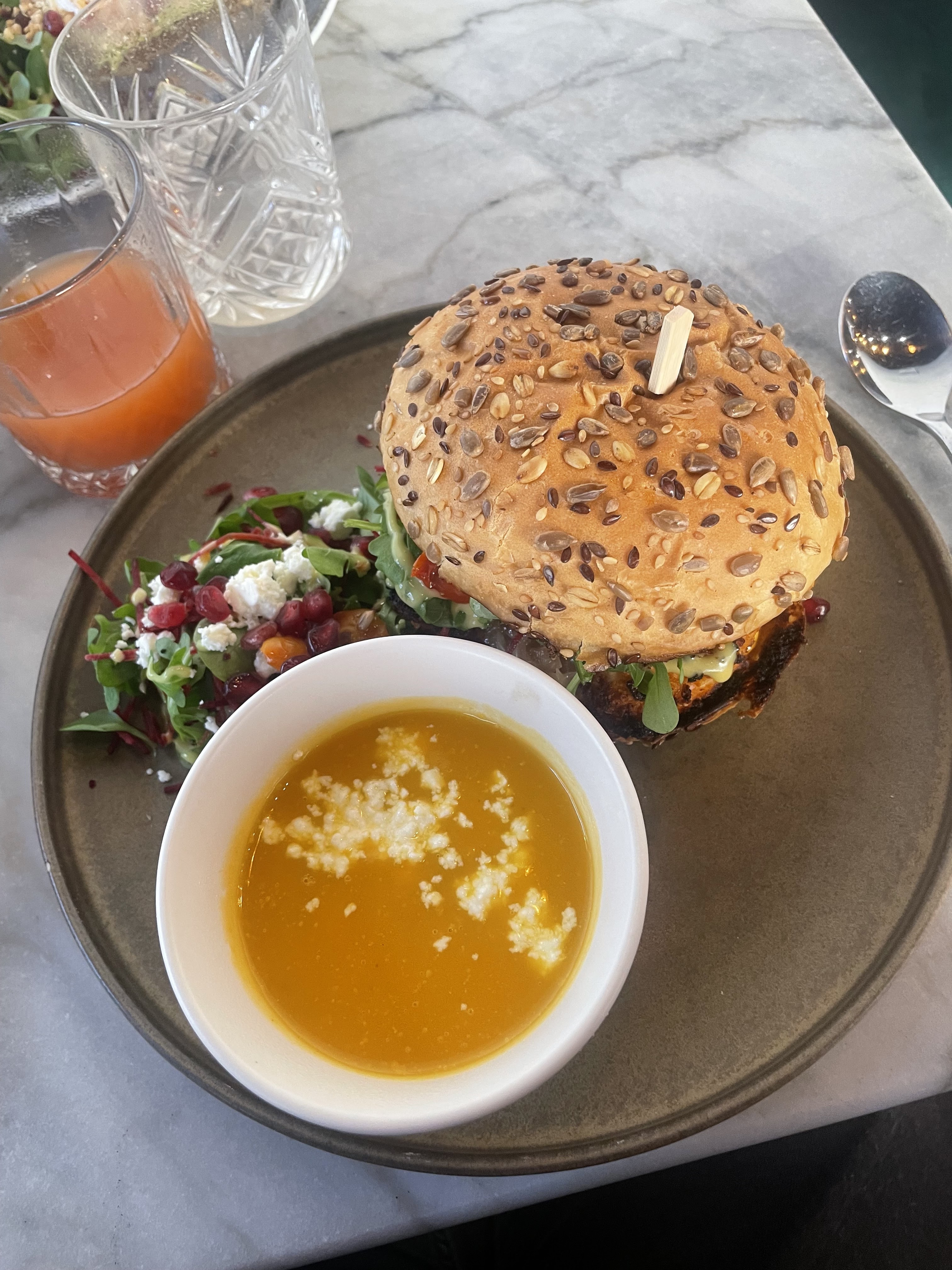 Brunch avec différent choix sur la carte. Il y en a pour tous les goûts. Malheureusement les associations ne sont pas les meilleurs. Le service quand à lui est vraiment bien. Notre serveuse Elodie était vraiment top et très impliquée. Toutefois pensez à réserver avant d’y aller car l’intérieur est beaucoup sympa que la terrasse dehors avec les abeilles qui tournent autour et le parasol qui nous tombe dessus. Heureusement nous avons pu gérer nous meme la situation. Je recommande seulement en intérieur.