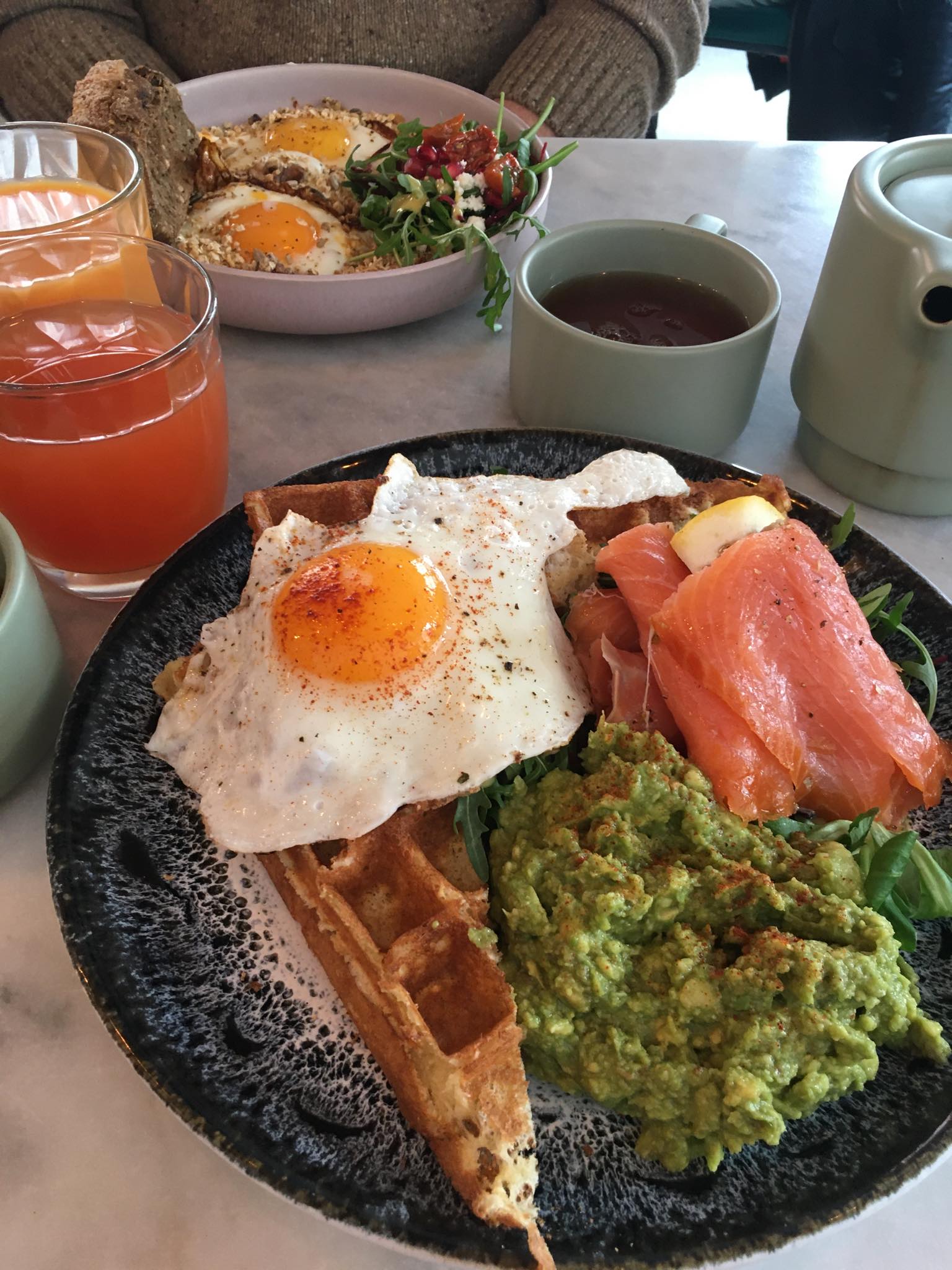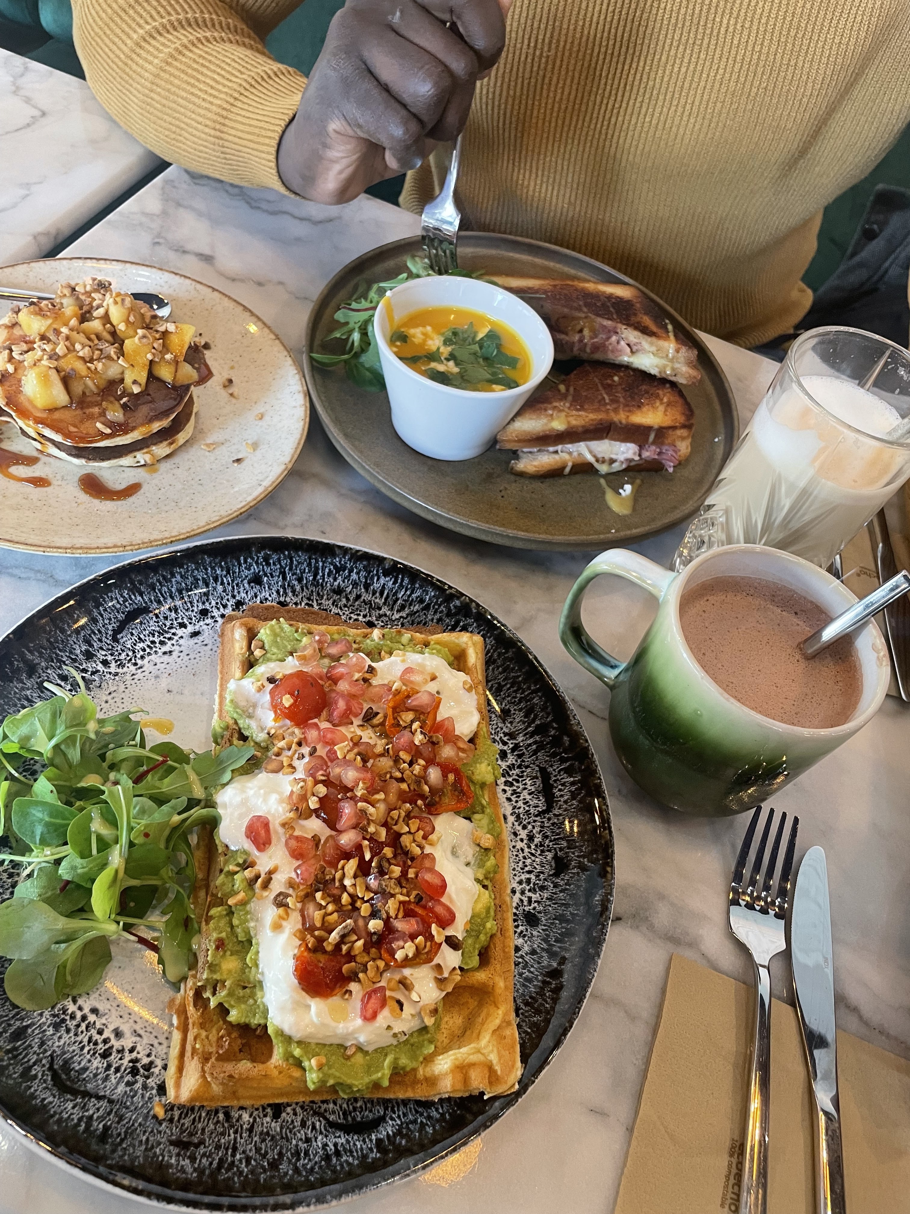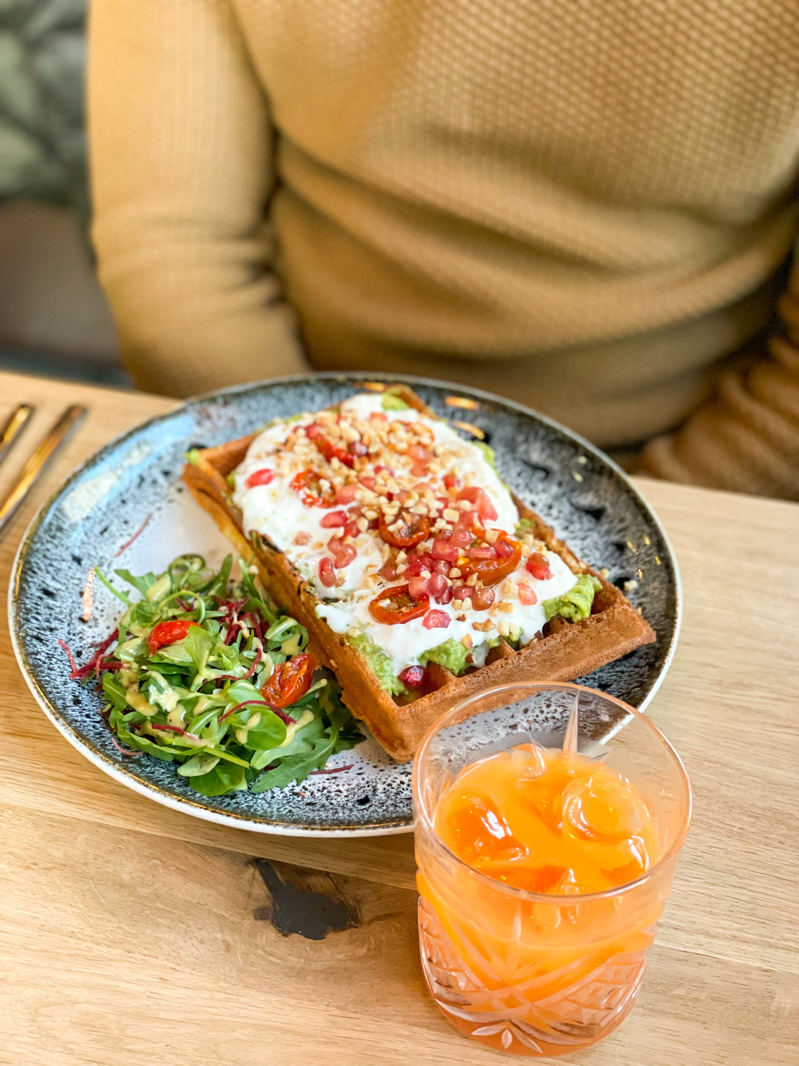 Brunch avec gaufre qui est à tombé par terre ! Service de qualité, produits de qualités, tout était parfait. Nous avons passée un très bon moment à sacré brunch. A très vite 🥰🫶🏽